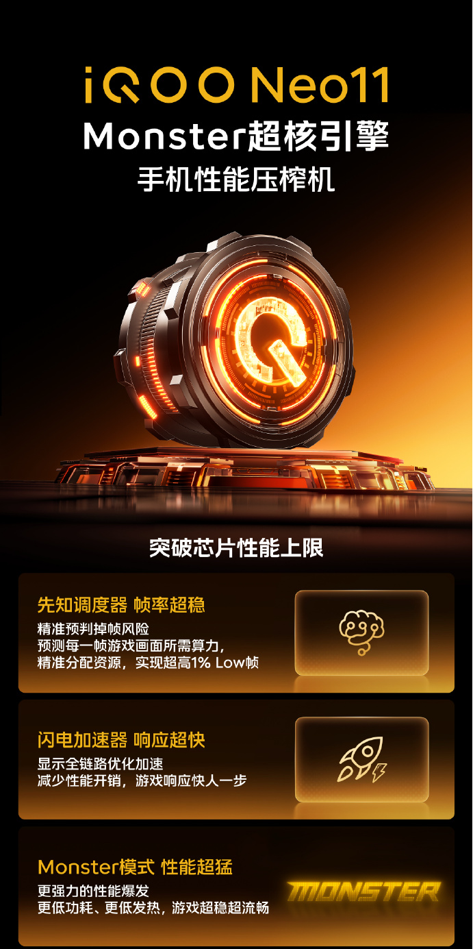 iQOO 15 同款的 Monster 超核引擎,是 Neo11 成为最强标准版的重要支撑,具备三大模块 —“先知调度器”精准预测掉帧风险,预测每一帧游戏画面所需算力,精准分配资源,实现超高 1% Low 帧;“闪电加速器”带来超快响应,优化加速显示全链路,减少性能开销,游戏响应快人一步;性能超猛的全新“Monster 模式”带来更强力的性能爆发、更低功耗和更低发热,让玩游戏做到超稳超流畅。