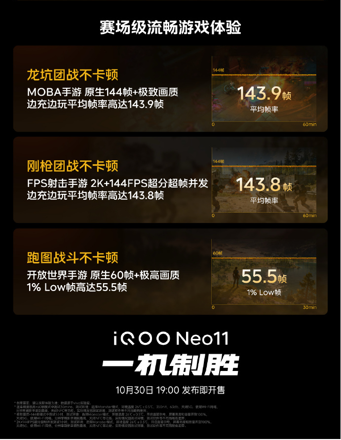 在 Monster 超核引擎的加持下,iQOO Neo11 带来领先的游戏体验,可以实现畅玩 MOBA 手游原生 144FPS + 极致画质,边充边玩平均帧率高达143.9FPS、畅玩 FPS 射击手游 2K + 144FPS 超分超帧并发,边充边玩平均帧率高达 143.8FPS,以及畅玩开放世界手游原生 60FPS + 极高画质,1% Low 帧高达 55.5FPS,轻松拿捏各大 Top 游戏重载场景。