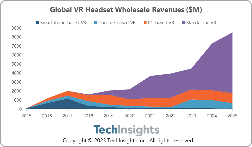 根据调研机构TechInsights最新发布的报告,VR头显批发收益将在2023年达到45亿美元,2024年预计将增加到近73亿美元,实现约62%的同比增长。