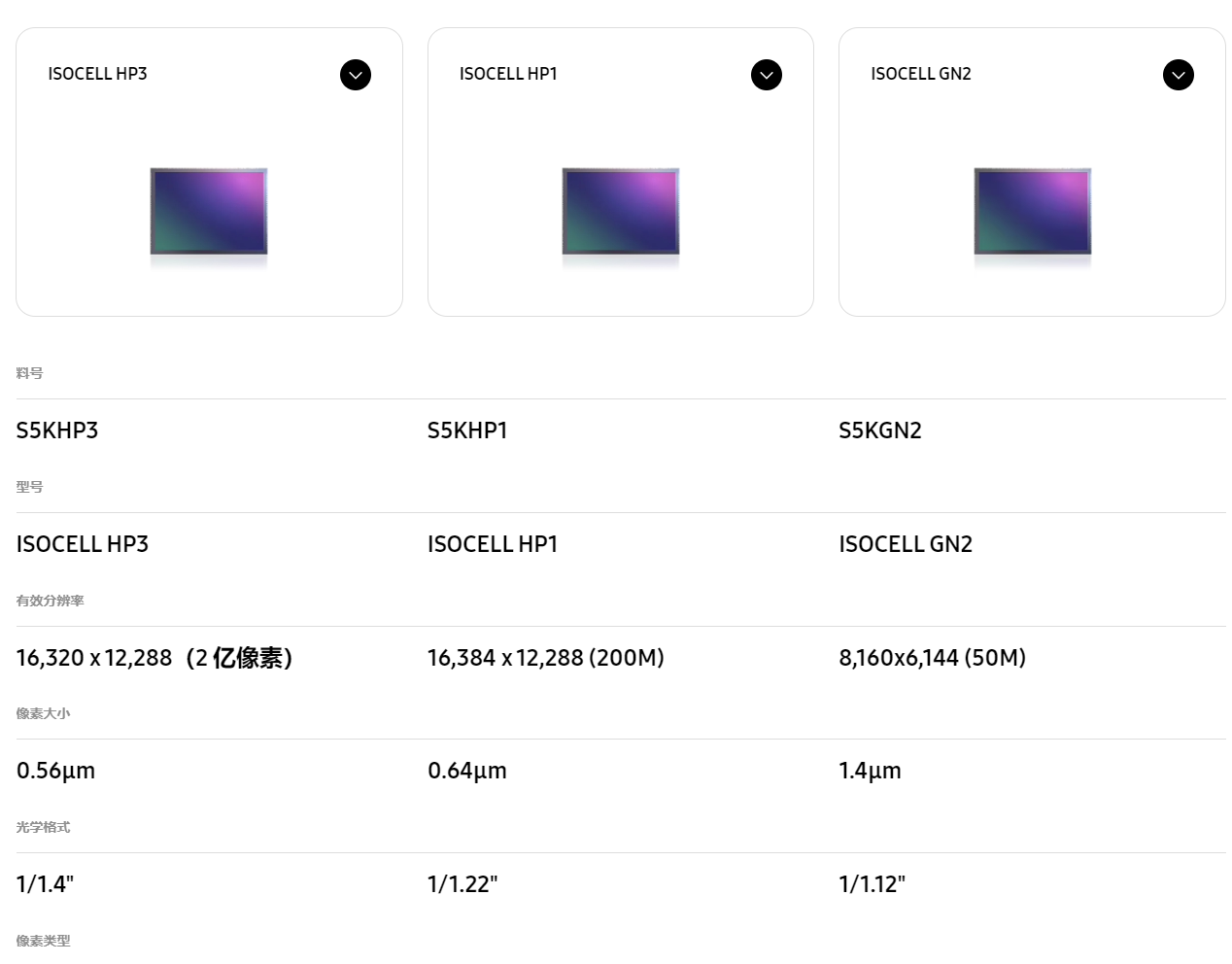 目前,三星官网列出的ISOCELL图像传感器有52款,其中比较常见的GN5、GN2、JN1、HP2、HP3、HPX等型号均有在列。