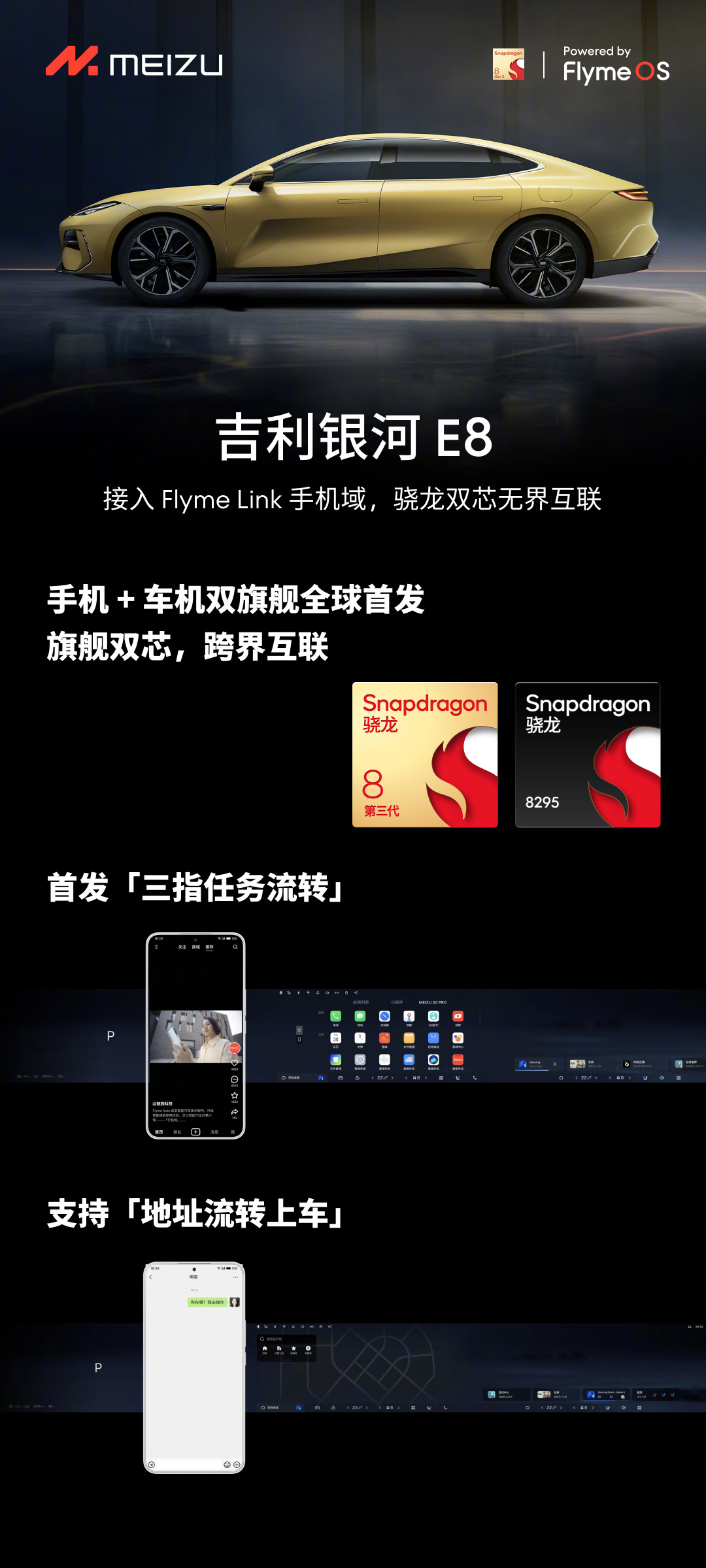 在下午的2023魅族秋季无界生态发布会上,魅族宣布搭载第三代骁龙 8 处理器的魅族21与搭载骁龙8295的吉利银河E8双旗舰全球首发,吉利银河E8接入Flyme Link手机域,首发搭载「三指任务流转」,支持「地址流转上车」等新功能。