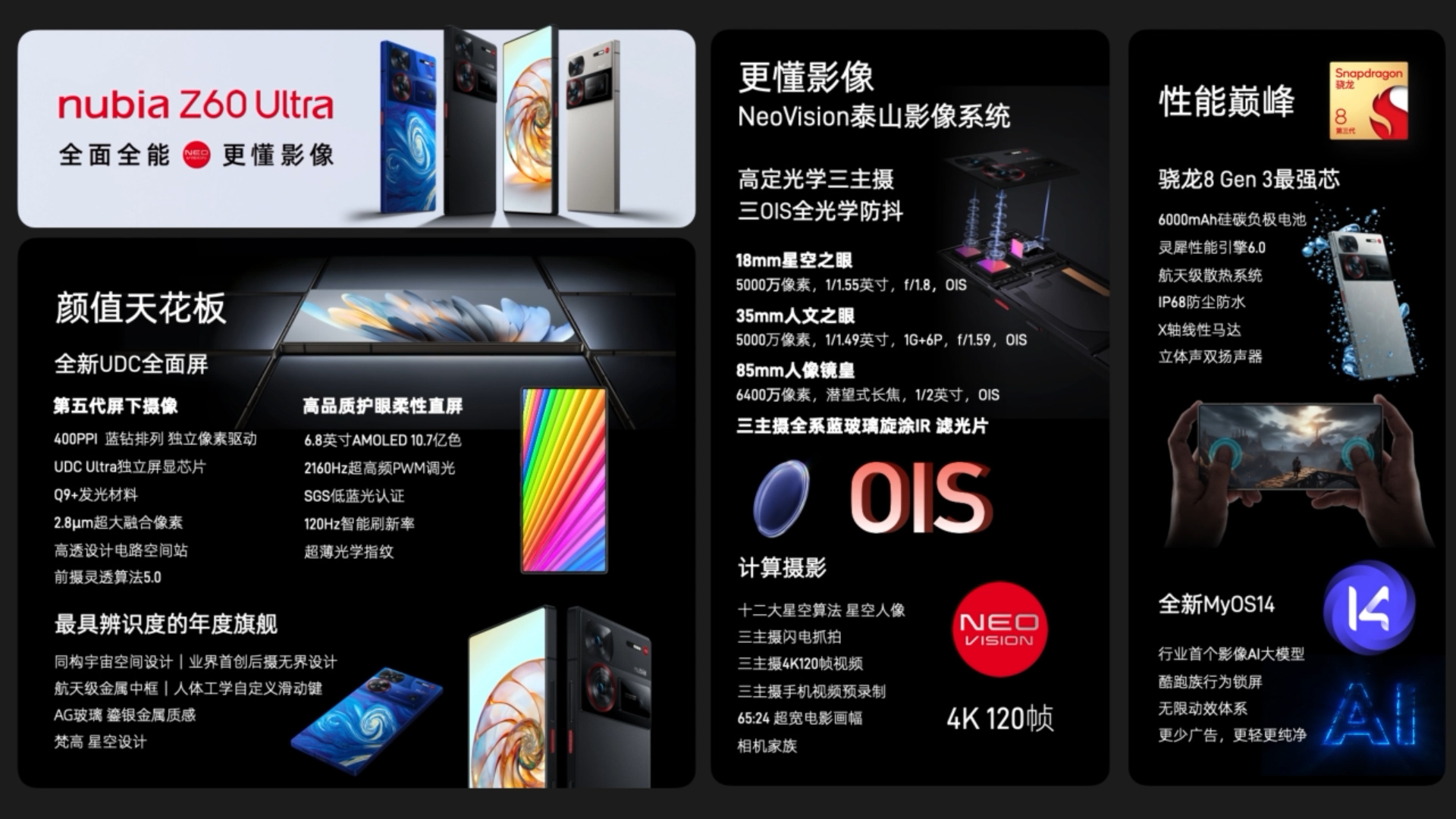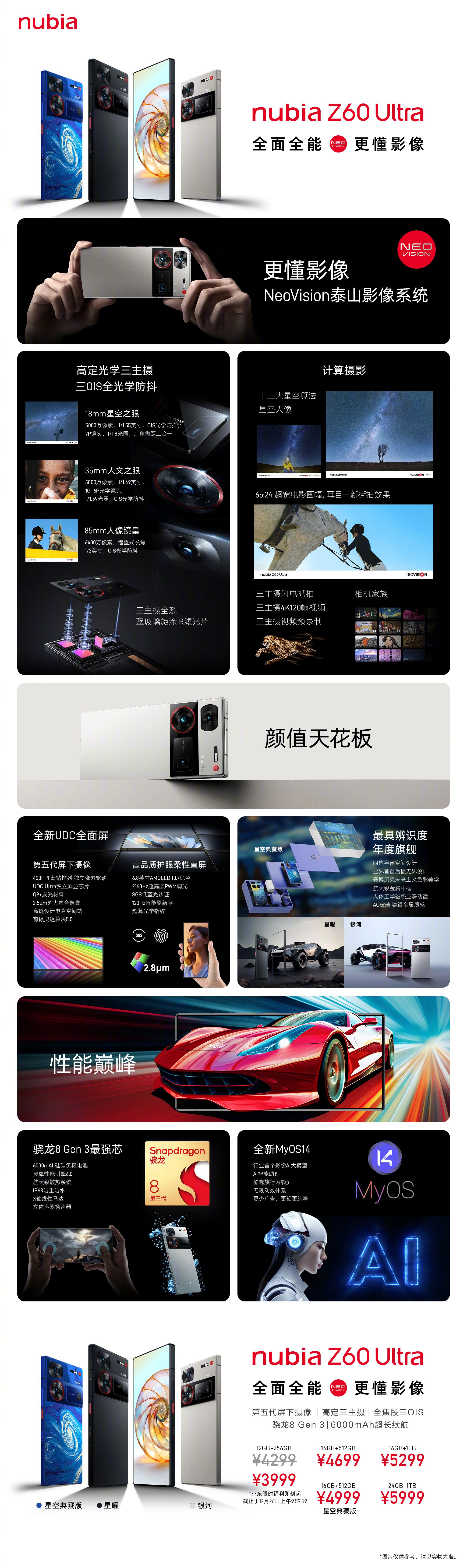 努比亚Z60 Ultra号称搭载业界首个垂直影像AI大模型,配备6000mAh超大电池,支持80W快充,支持IP68防尘防水、USB 3.1、红外遥控,运行MyOS 14系统。