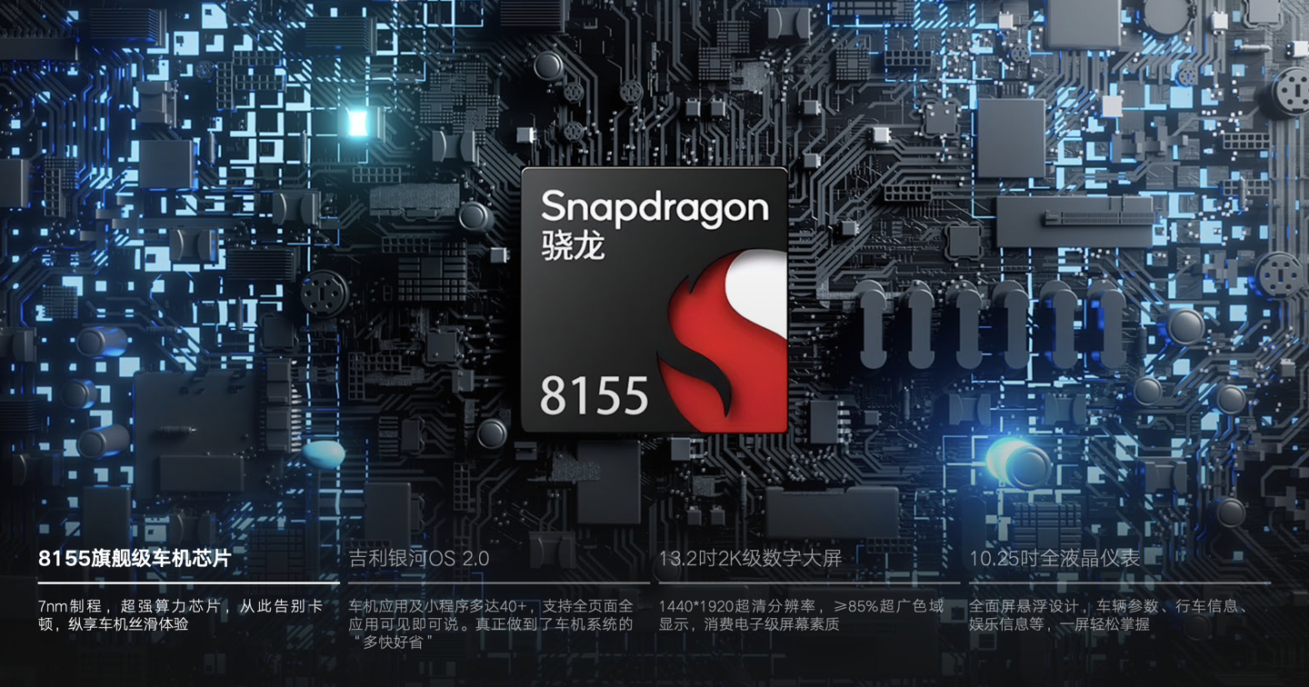 吉利博越COOL朋友版搭载高通骁龙8155芯片,据称是“价格最低的骁龙8155座舱之一”,全系标配10.25英寸全液晶数字仪表及13.2英寸2K分辨率中控,搭载银河 OS 2.0 车机系统,支持人脸识别和L2 辅助驾驶系统。