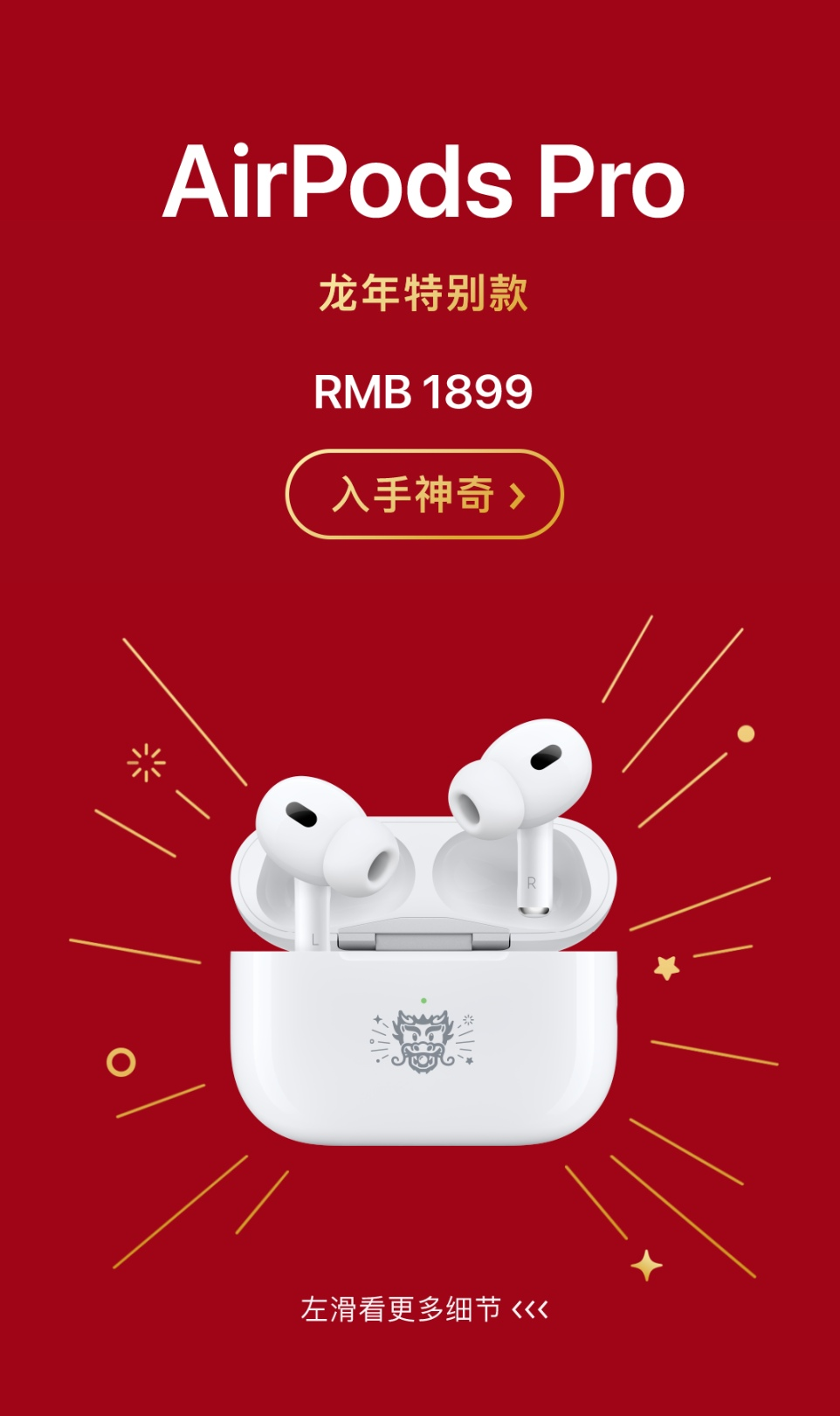 苹果推出了第二代AirPods Pro龙年特别款,售价1899元,与普通版相同。AirPods Pro龙年特别款在外包装和充电盒上采用了独特的龙年设计元素,印有烟花与星星环绕的定制龙头表情符号。
