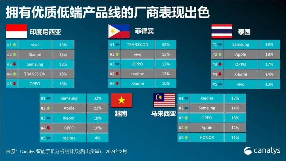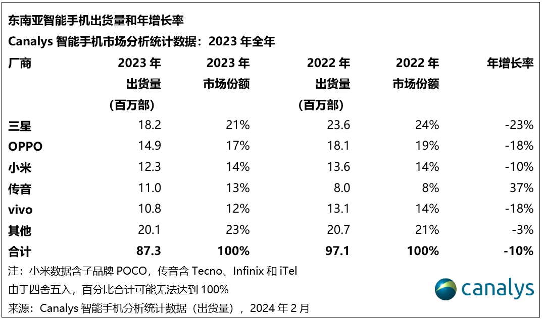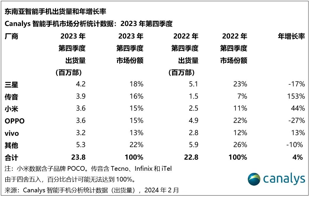 三星在第四季度的东南亚市场保持领先地位,市场份额达到18%;传音首次排名第二,占据了16%的市场份额,并实现了153%的同比增长。