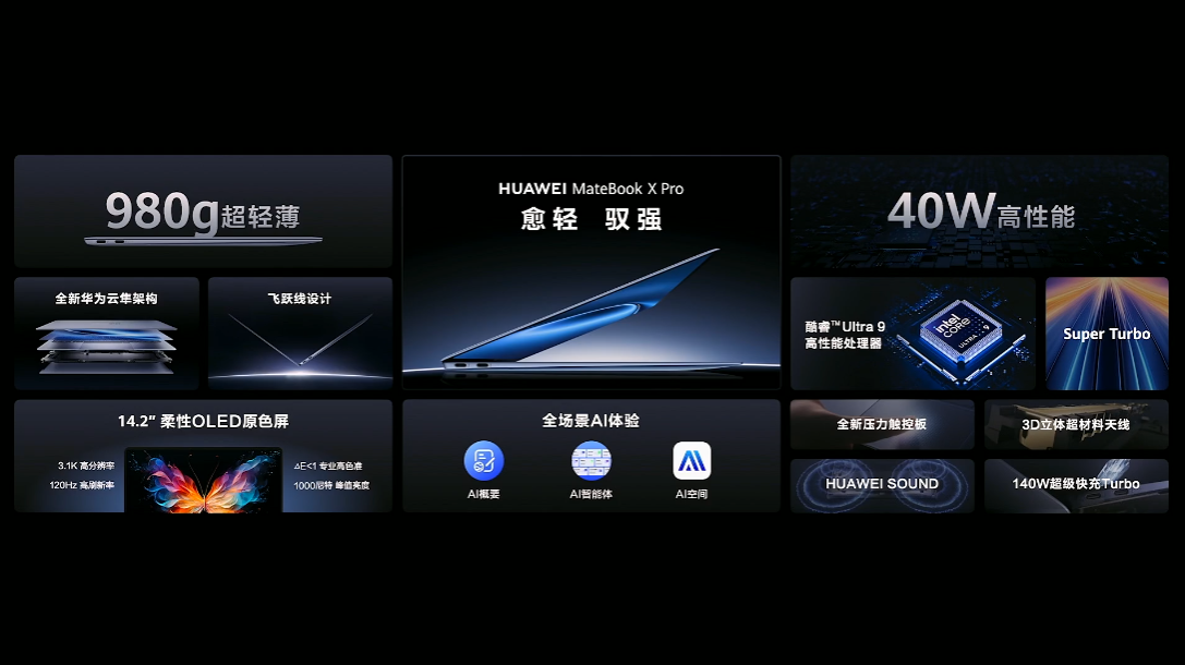 该笔记本有砚黑、宣白、晴蓝三种配色,首次应用华为盘古大模型,带来全新AI概要与AI空间。该笔记本还配有全新压力触控板、140W超级快充Turbo。