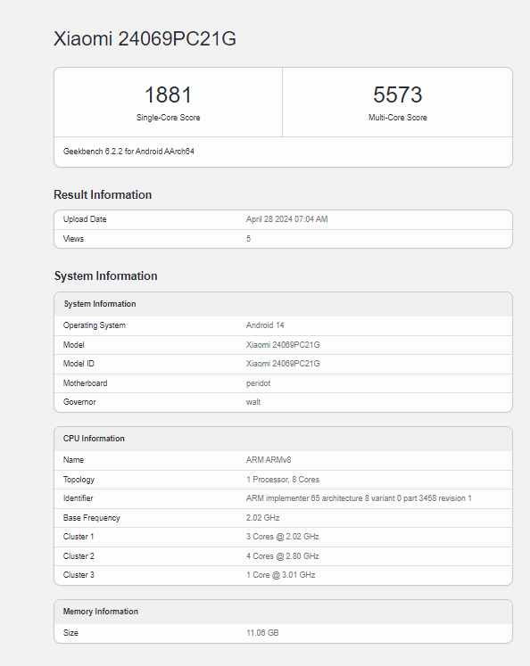 罗布其实小米 POCO品牌将在全球市场推出POCO F6系列新机,该机近期已现身Geekbench平台,型号为24069PC21G;其在单核测试中获得了1881分,在多核测试中获得了5573分,搭载12GB内存,运行基于Android 14的系统,处理器则为骁龙 8s Gen3。