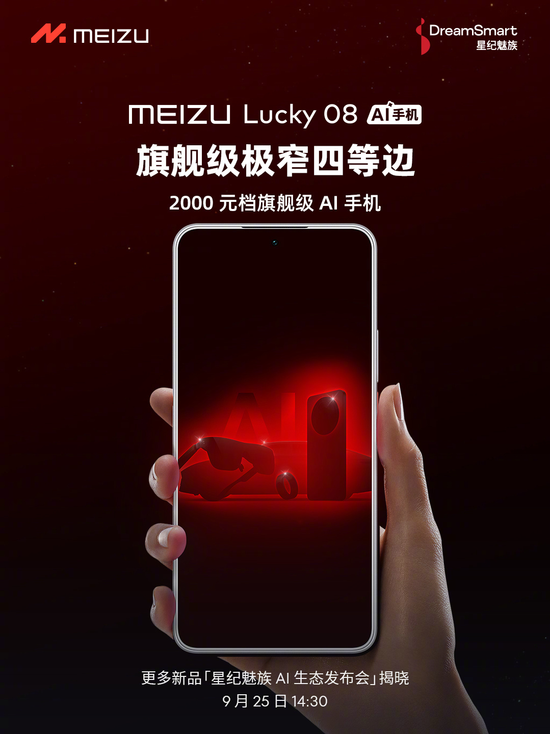 星纪魅族科技与9月12日正式官宣将于9月25日举行星纪魅族AI生态发布会,届时将发布Flyme AIOS、魅族Lucky 08、领克Z10电竞定制版、StarV View AR智能眼镜等新品。9月13日,官方也对魅族Lucky 08的外观进行了预热。
