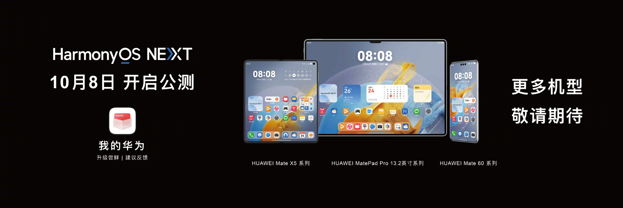 在华为秋季全场景新品发布会上,华为官方正式宣布鸿蒙HarmonyOS NEXT系统将于10月8日开启公测。首批将适配华为Mate60系列、Mate X5系列手机,以及MatePad Pro 13.2英寸系列平板。据了解,在公测后,消费者可通过“我的华为”APP-“升级尝鲜”申请升级。