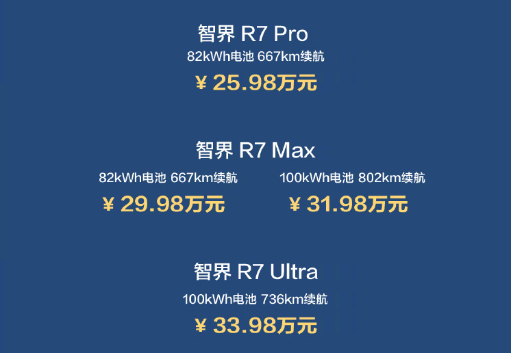 动力方面,智界R7配备华为电机系统,有单电机和双电机两个动力版本,功率分别为215kW、365kW,零百加速最快仅需3.9秒。该车全系标配800V碳化硅高压平台,CLTC工况最大续航里程802km。