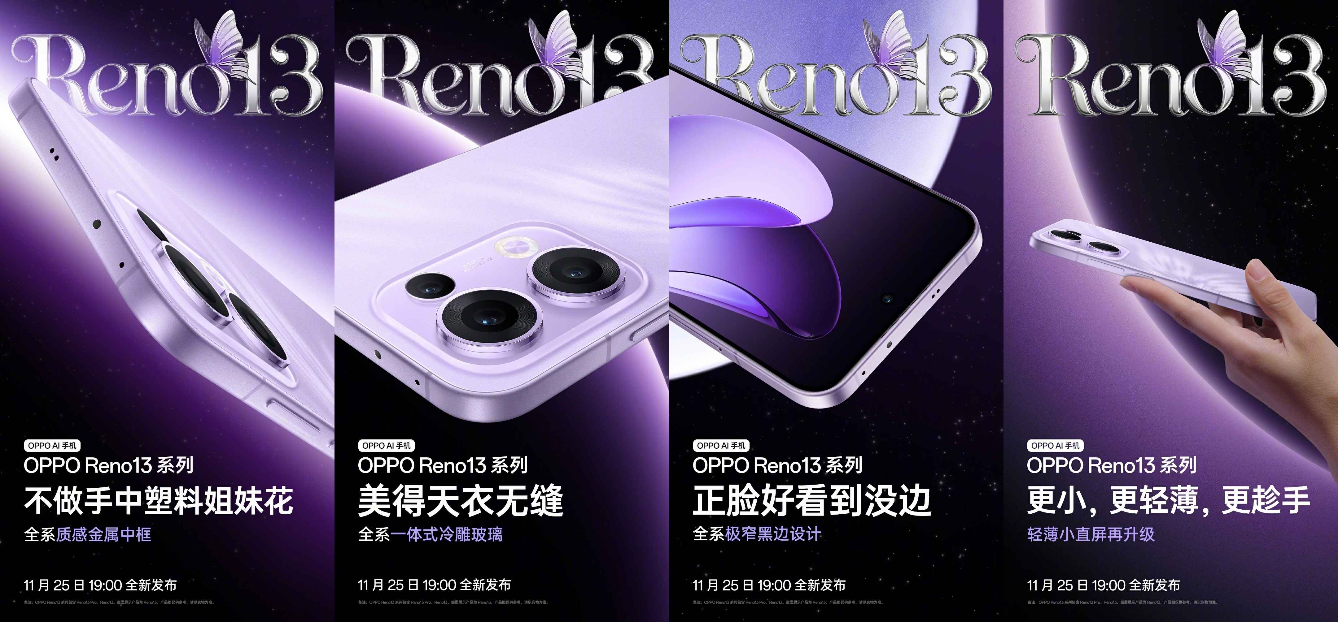11月18日,OPPO官方正式公布了OPPO Reno13系列的设计细节。新机将全系标配金属中框、一体式冷雕玻璃等多项设计工艺,并将于11月25日正式发布。