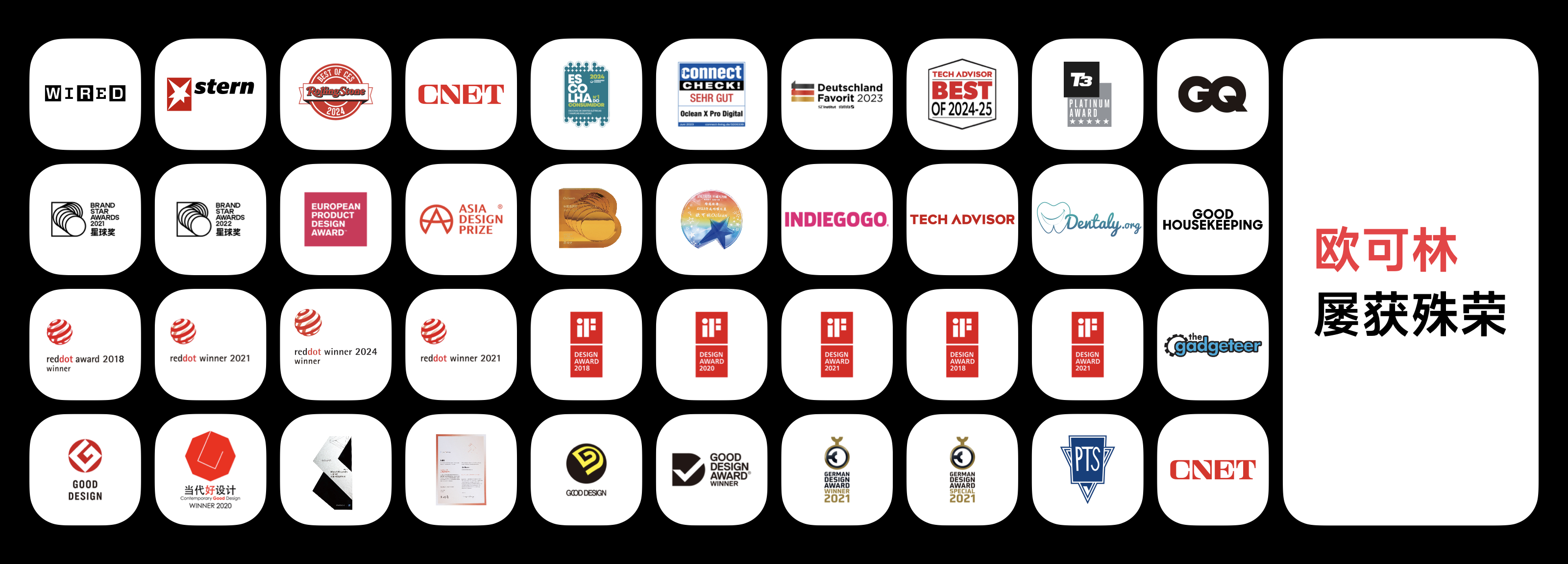 同时,Oclean欧可林的产品设计也已在行业率先实现了德国红点设计奖、德国iF设计奖、日本优良设计大奖、韩国好设计奖、亚洲好设计奖、德国设计奖、中国当代好设计奖等全球设计奖项的“大满贯”。