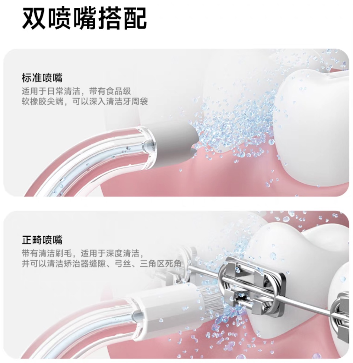 欧可林AirPump A10氧气啵啵冲牙器还提供了标准喷嘴和正畸喷嘴的搭配,后者带有清洁刷毛,可有效清洁矫治器缝隙、弓丝、三角区死角等,贴心呵护正畸用户的口腔健康。