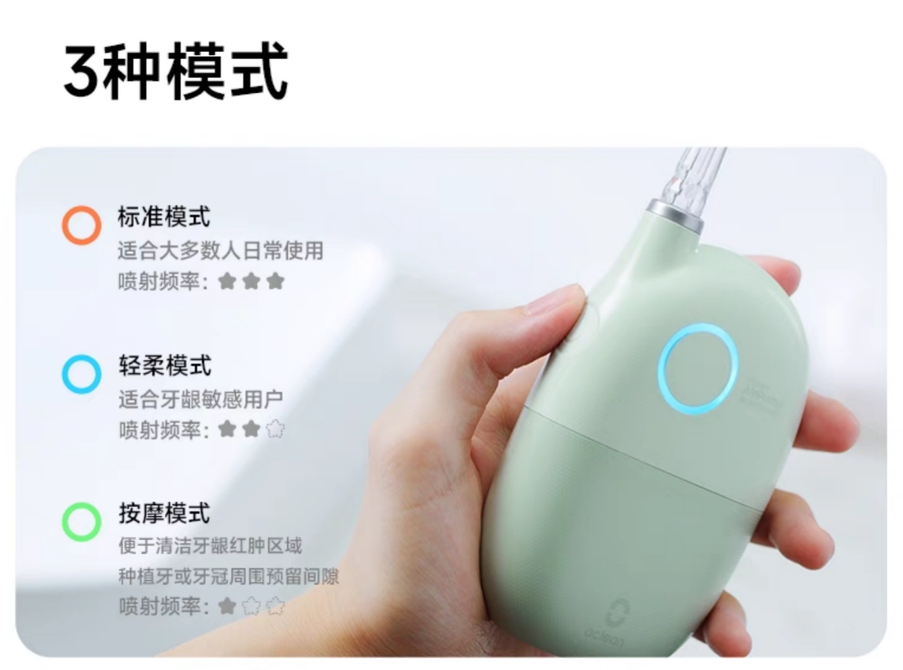 这便是欧可林AirPump A10氧气啵啵冲牙器的核心护牙科技——Oclean AirPump空气动力,通过水与气的结合喷射,为用户提供更加柔且高效的清洁体验。