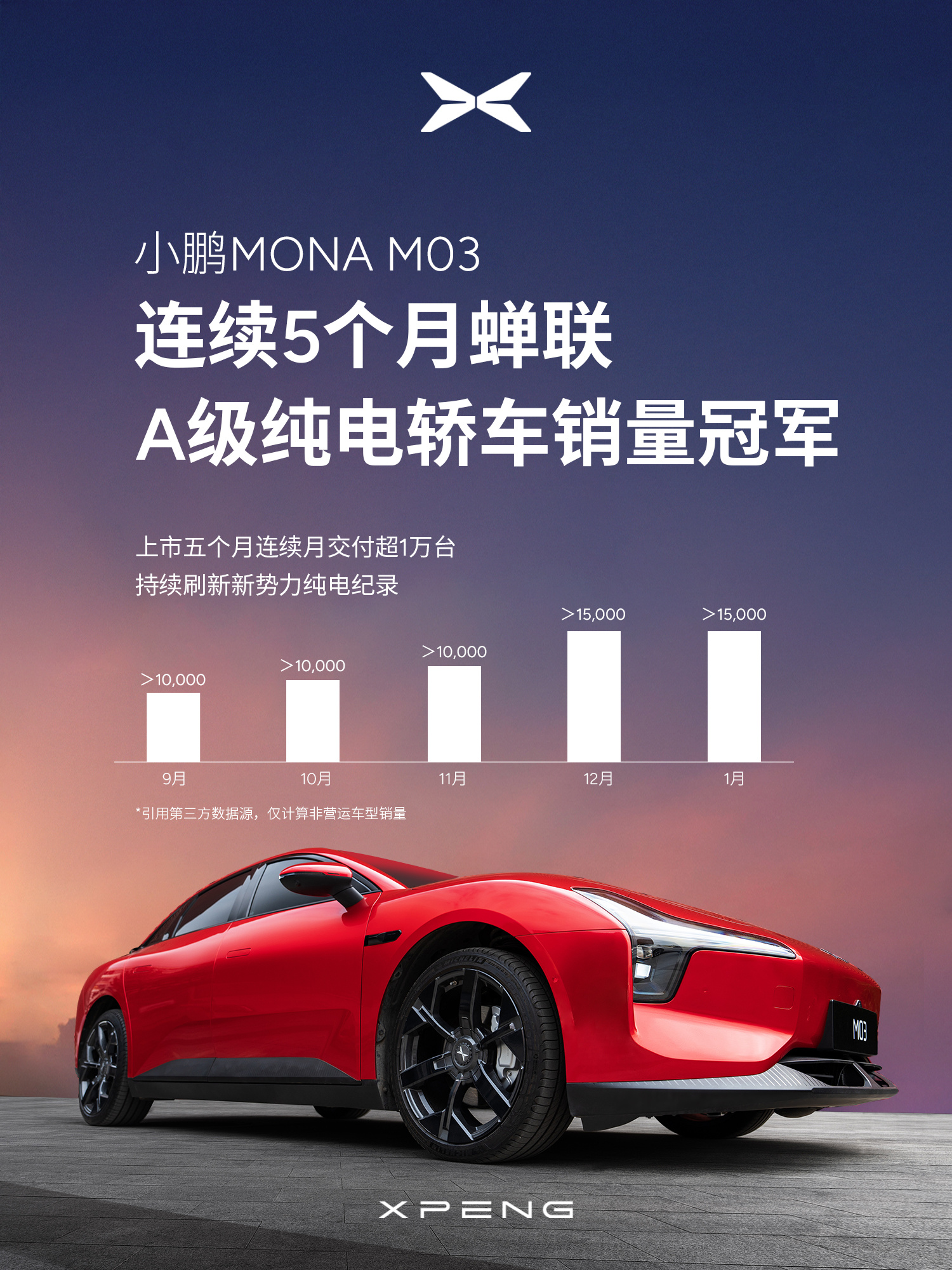 小鹏汽车于今日官宣,小鹏MONA M03连续5个月蝉联A级纯电轿车销量冠军。自上市以来,该车已连续5个月的月交付超1万辆,刷新了新势力交付纯电纪录。
