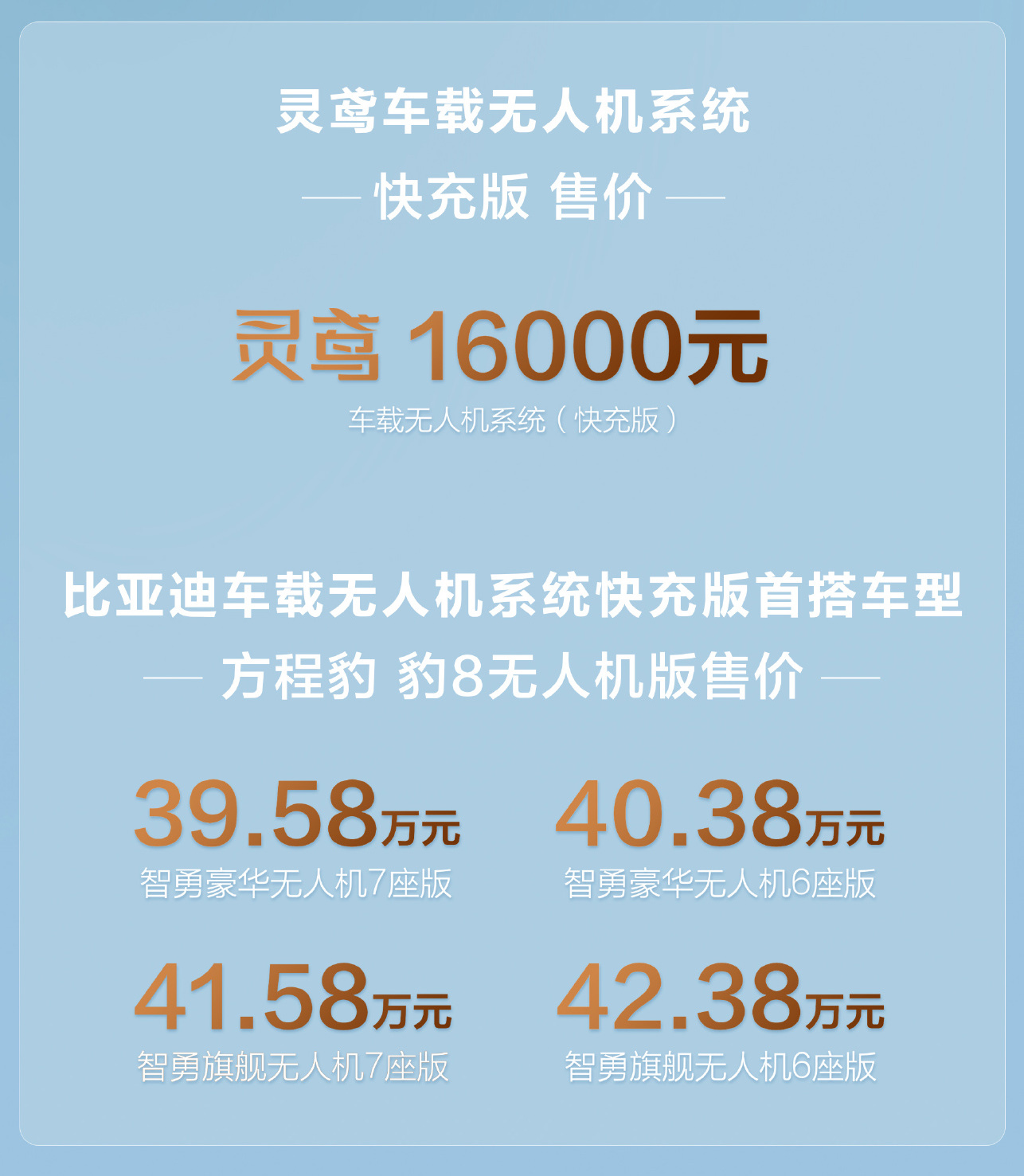 此次“灵鸢”推出了换电版和快充版,其中换电版主要搭载在仰望品牌,快充版则搭载在比亚迪王朝、海洋、腾势、方程豹上。而“灵鸢”整套车载无人机系统快充版的售价为16000元,首搭车型为方程豹豹8无人机版。