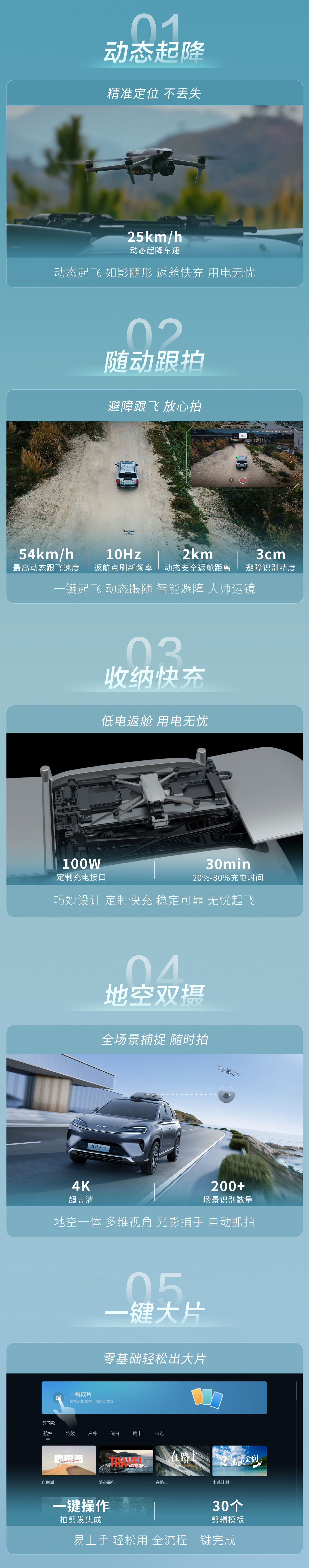 据了解,“灵鸢”这套车载无人机系统实现了架构、硬件、算法、生态开放上的四大先进,运用到全球首创的车载伸缩停机坪方案,融合了车载无人机定位模块、4K高清车顶摄像头、定制双模式手柄等硬件,支持动态起降、一键返舱、随动跟拍以及收纳快充等功能,还内置有30套拍摄模板及智能算法,无需过多操作即可一键成片。