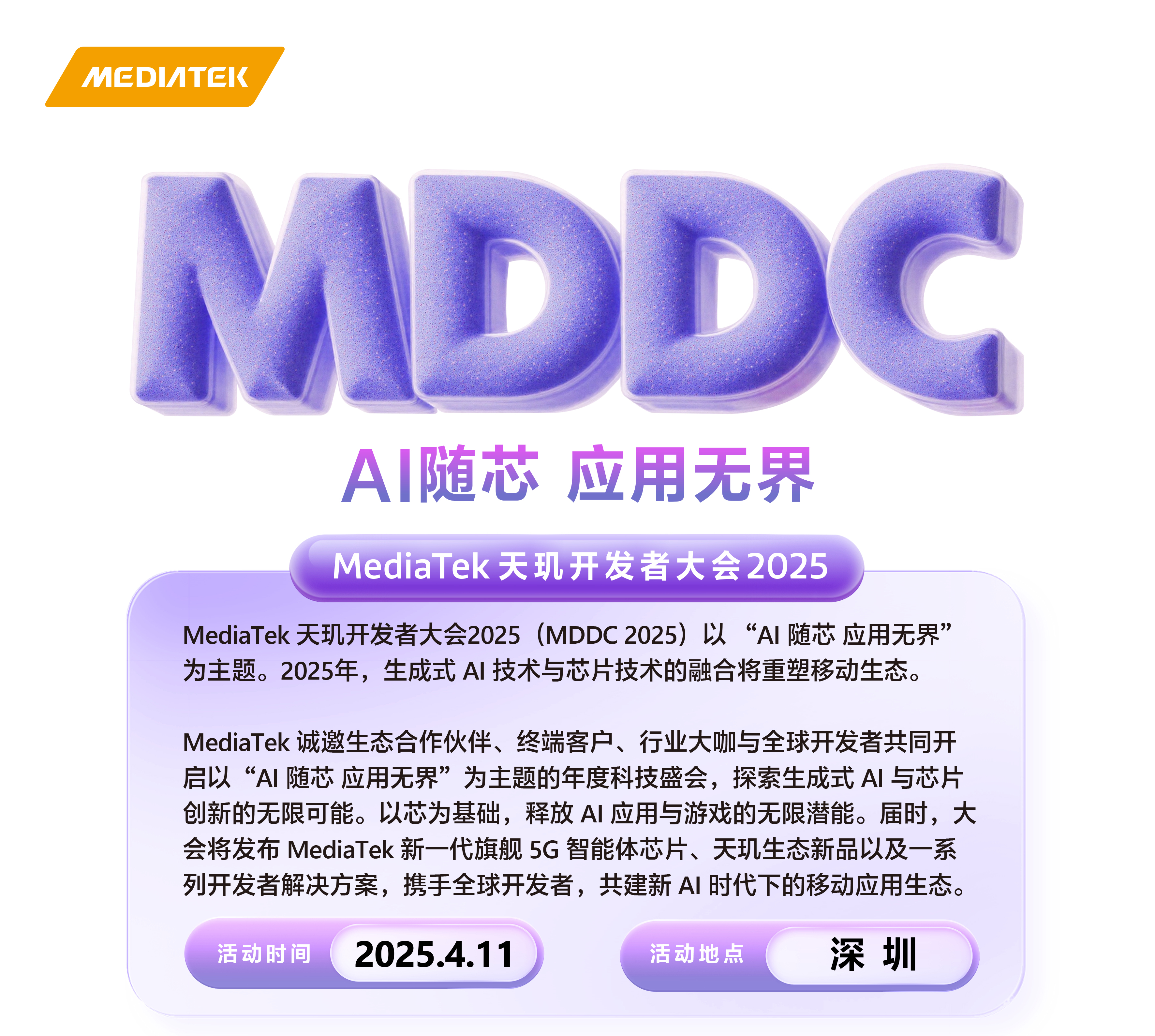 近日,联发科官宣将于4月11日举行MediaTek天玑开发者大会2025(MDDC2025),届时将发布MediaTek新一代旗舰5G智能体芯片。结合已知爆料来看,该芯片基本可以确定是天玑9400+。