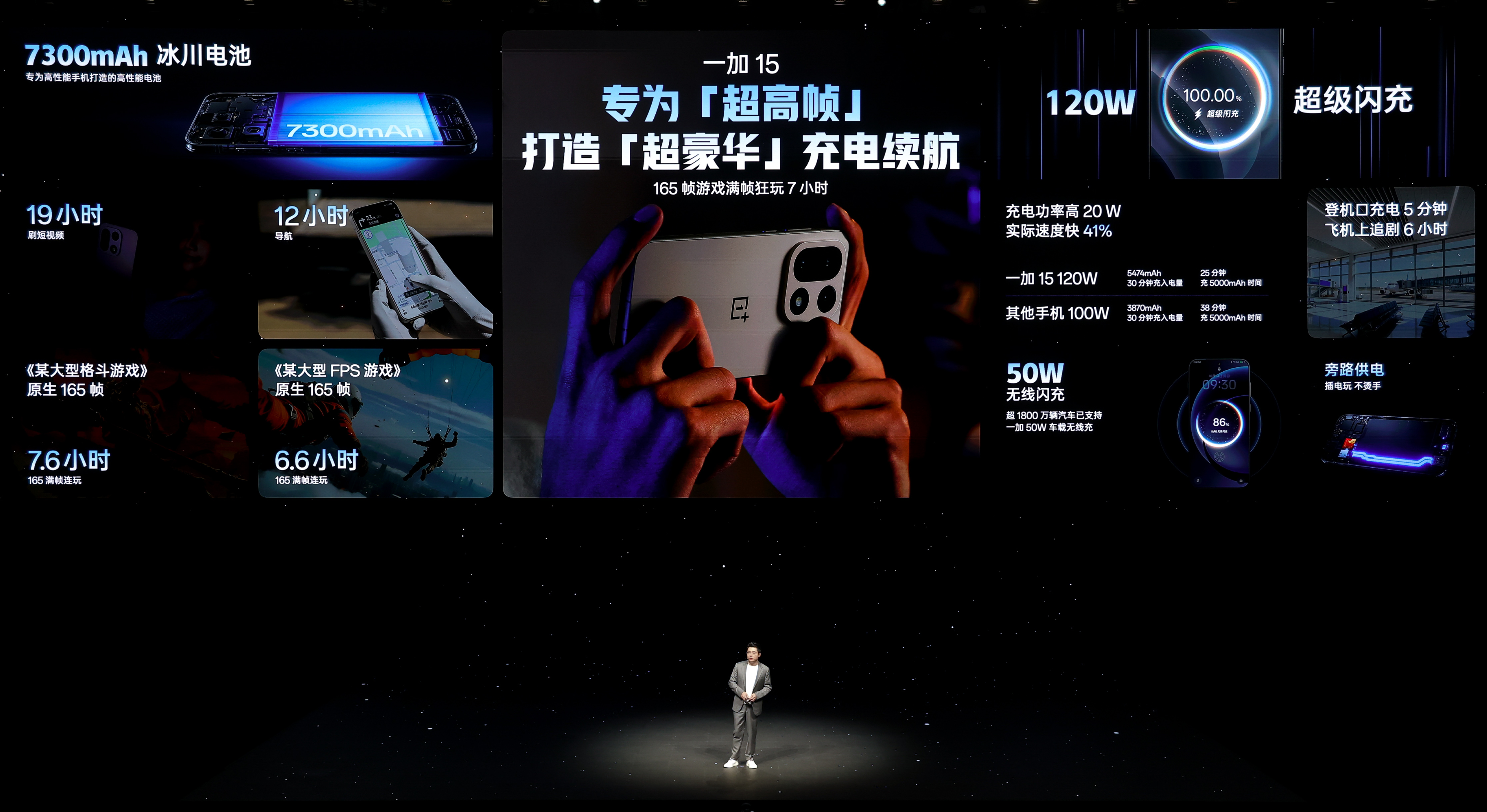 一加 15 搭载专为高性能手机打造的 7300mAh 超大「冰川电池」,配合 120W 超级闪充,带来旗舰档位手机中最豪华的充电续航组合。一加 15 所搭载的电池采用新一代仿生硅碳材料与双电芯结构,能量密度高达 814Wh/L,足以支撑全天候续航需求。一加 15 支持行业领先的 120W 有线闪充,同时还配备 50W 无线闪充,为用户带来更加灵活的充电选择。针对游戏场景,一加 15 带来行业首发「局间补电」技术,还搭载行业领先的「旁路供电」功能,确保玩家在长时间对战中也能保持满血状态。