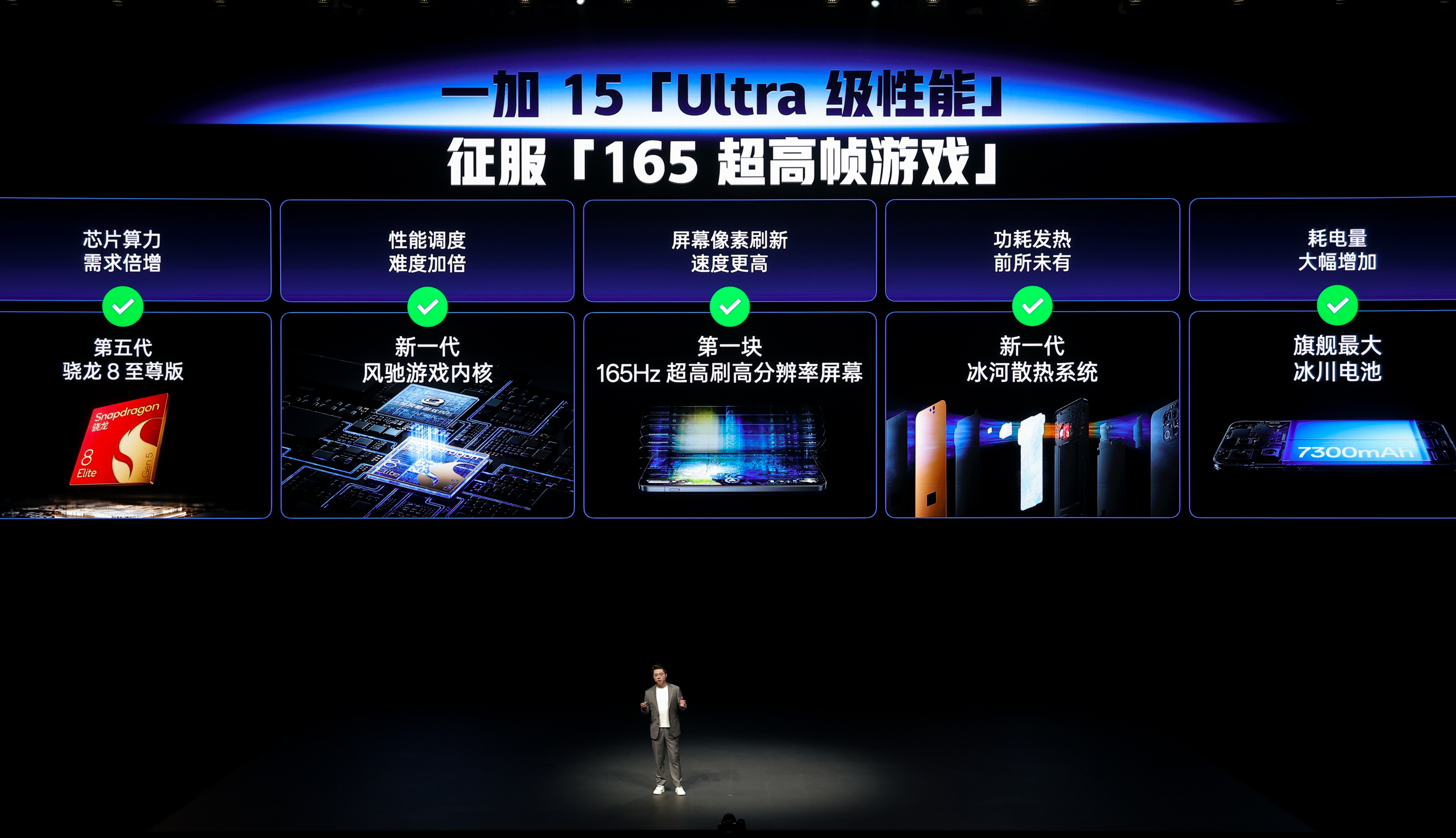 作为一加数字系列全新成员,一加 15 在性能、散热、触控、网络等方面带来无短板的出色表现,是行业首部真正意义上的「性能 Ultra」旗舰,引领行业进入 165 超高帧游戏时代。一加 15 搭载第五代骁龙 8 至尊版以及全新一代「风驰游戏内核」,配合全新「冰河散热系统」,实现满血性能释放,配合「电竞网络芯片 G2」与「灵犀触控芯」,为用户带来极致流畅的 Ultra 级游戏体验。一加 15 首发全球首块 165Hz 超高刷高分辨率第三代东方屏,在流畅度、屏幕素质、暗夜显示、护眼能力四大维度带来引领行业的表现。一加 15 还搭载 OPPO 自研 LUMO 凝光影像,拥有同档唯一的 7300mAh 超大电池+120W 闪充续航组合以及全面焕新的 ColorOS 16 系统。