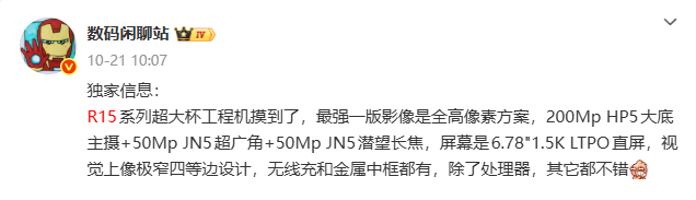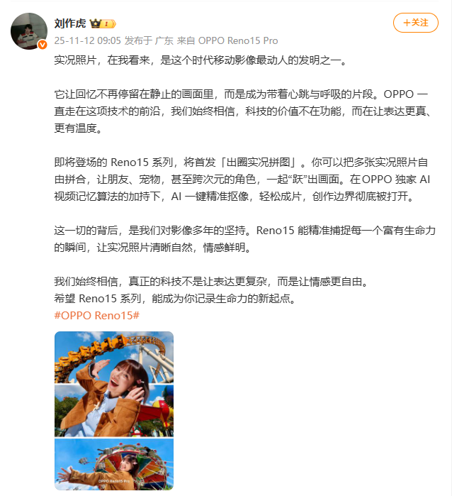 11月12日,OPPO首席产品官@刘作虎 发文称“即将登场的 Reno15 系列,将首发「出圈实况拼图」。”