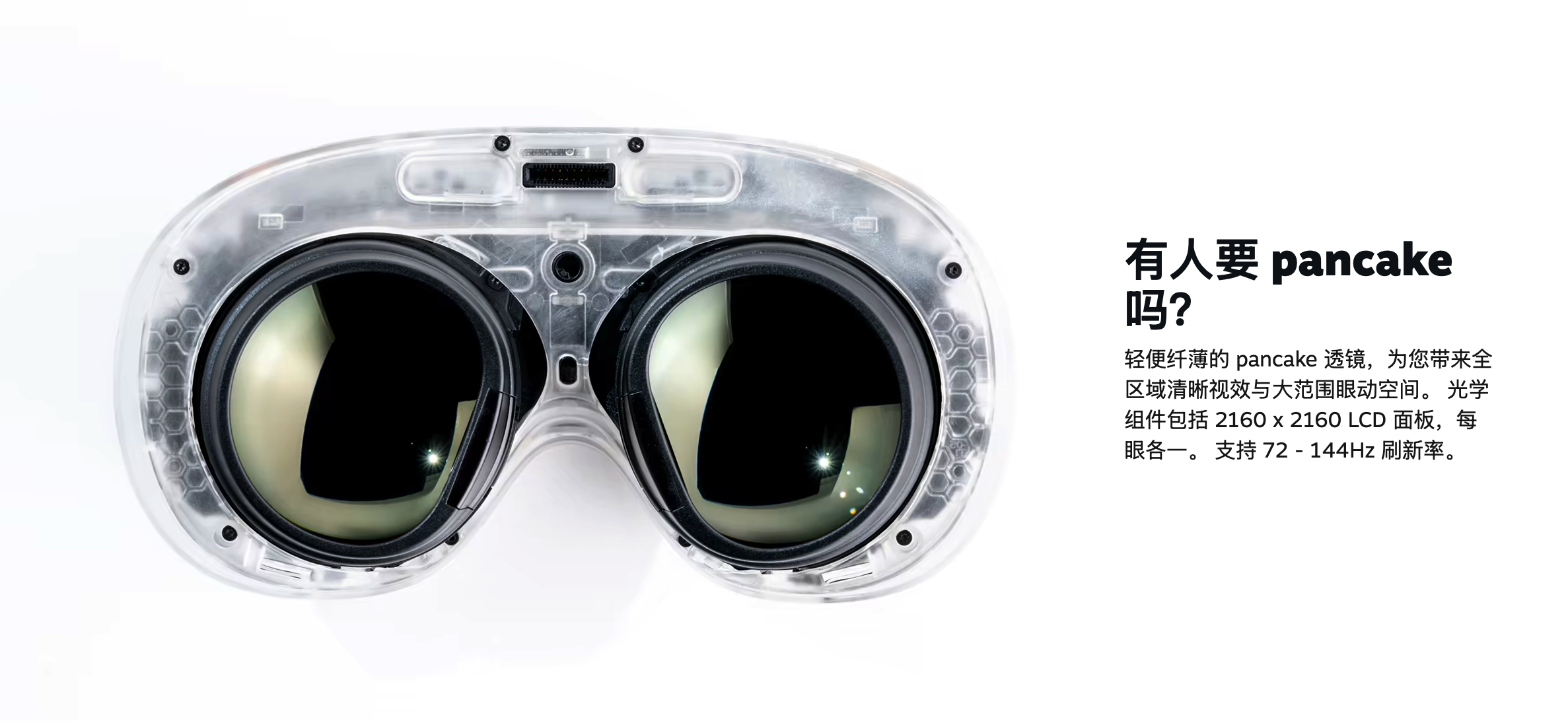 同时,这代产品同步改进了透镜,改为轻便纤薄的pancake透镜,光学组件分辨率升级为2160 x 2160 LCD面板,每眼各一,支持72 - 144Hz刷新率,新增刷新率可适配不同性能需求与场景,兼容性更灵活。