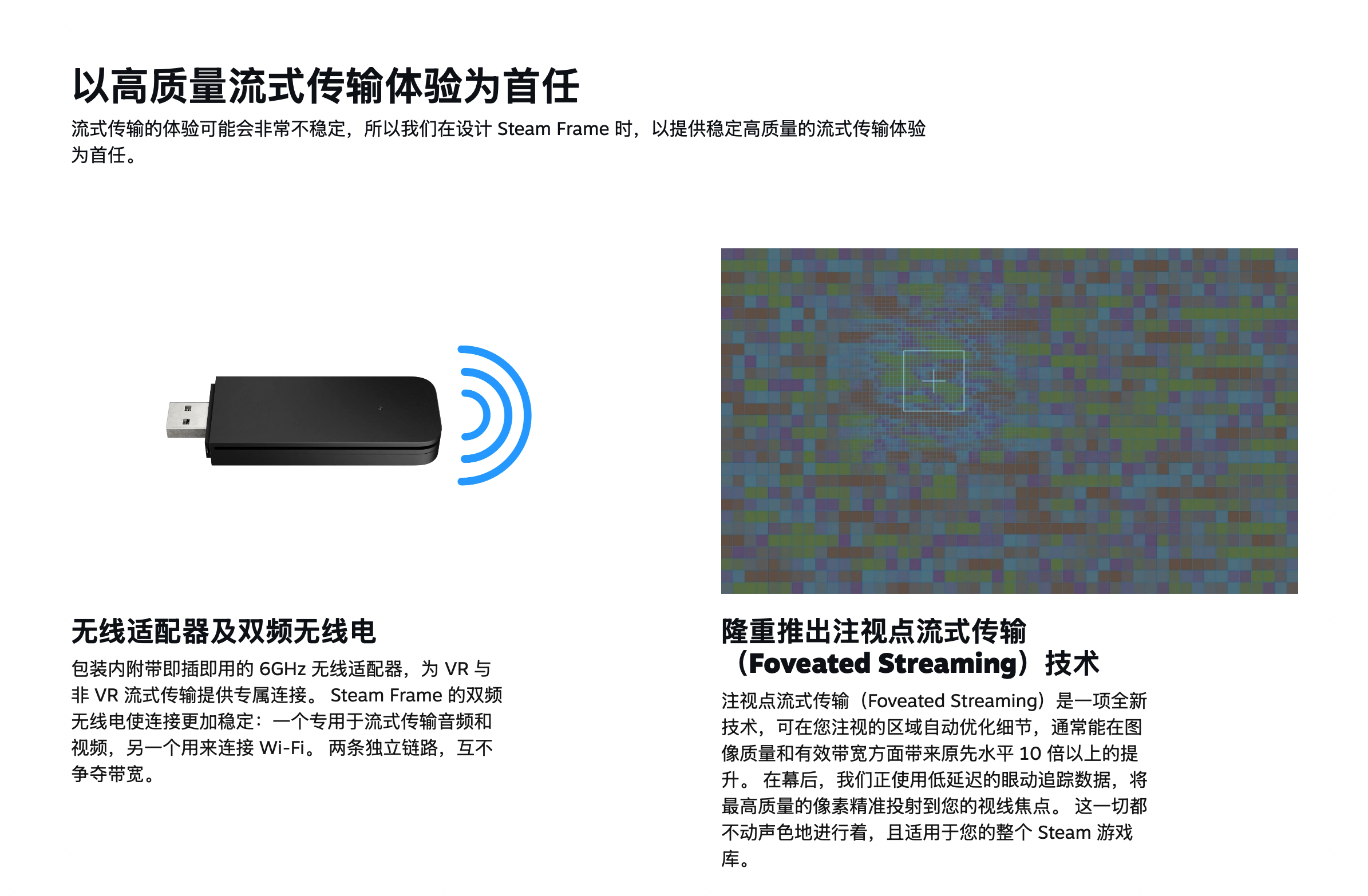 为了提供更具沉浸式的视觉体验,Steam Frame新推出视点流式传输(Foveated Streaming)技术,可在玩家注视的区域自动优化细节,通常能在图像质量和有效带宽方面带来原先水平10倍以上的提升。换言之,此举可让更高质量的像素精准投射到玩家视线焦点。