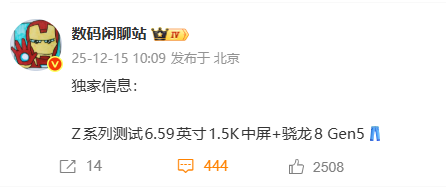 今日,博主@数码闲聊站透露,某品牌Z系列新机正在测试6.59英寸1.5K中屏,并配发布裤子表情包。结合该系列产品过往信息,外界推测这款新机或为iQOO Z系列新一代机型——iQOO Z11。