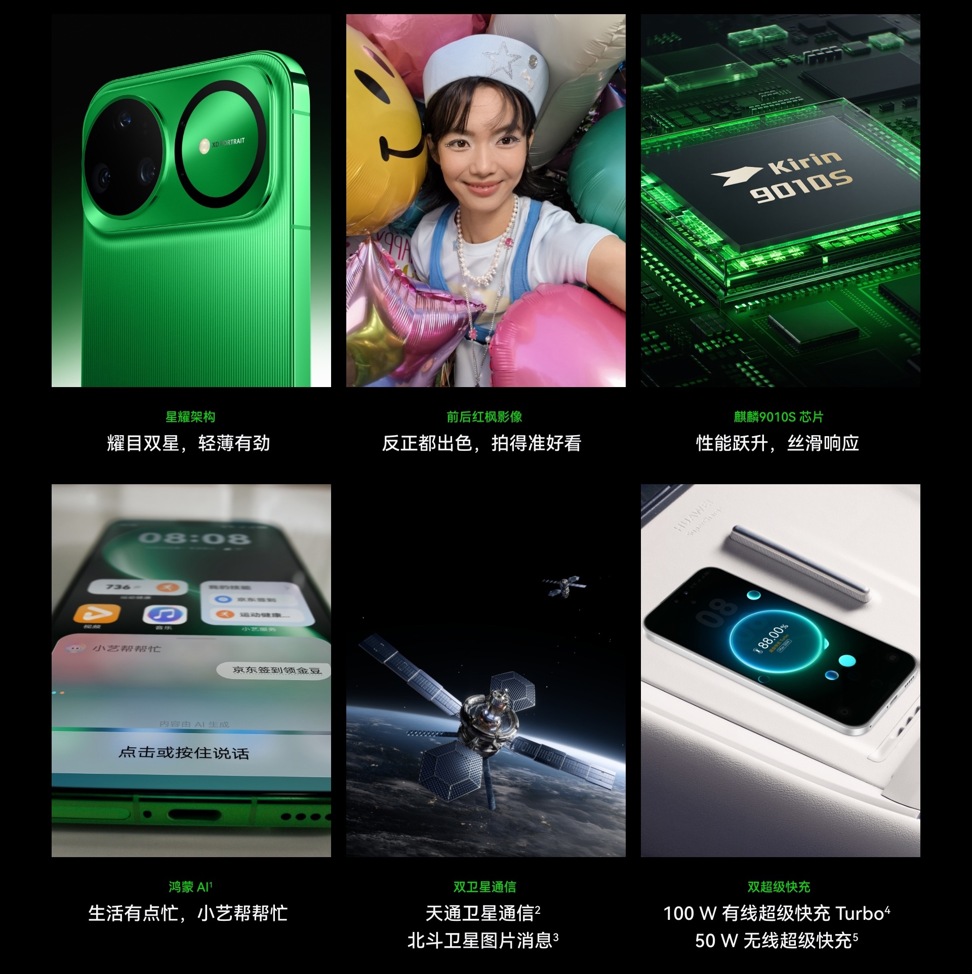 华为nova15全系预装HarmonyOS 6系统,全系搭载麒麟芯片,以及支持旗舰级影像系统、百瓦快充和卫星通信功能等重磅配置。
