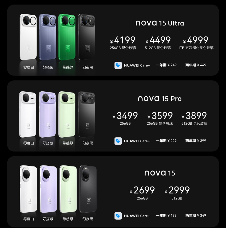 nova15 Ultra:256GB昆仑玻璃售价4199元,512GB昆仑玻璃售价4499元,1TB玄武钢化昆仑玻璃售价4999元;