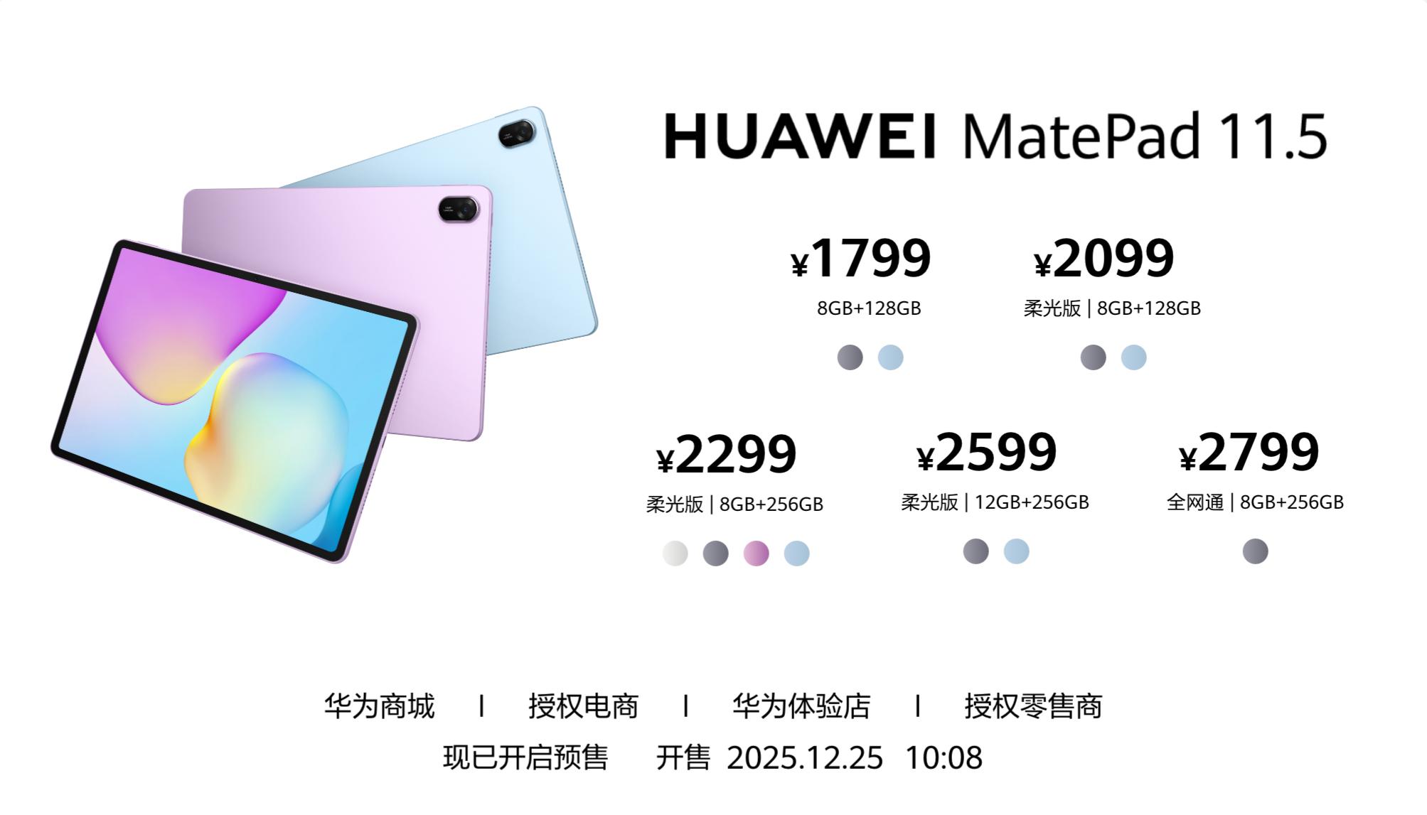 12月22日,华为终端官方宣布,华为MatePad 11.5 2026正式发布并开启预售,定价1799元起,将于12月25日10:08正式开售。