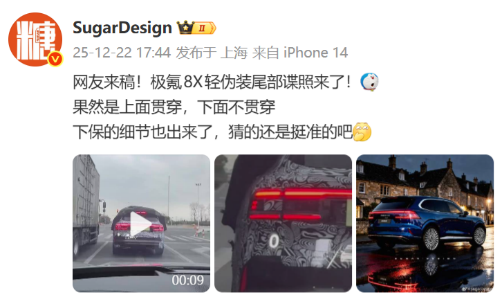 12月22日,博主@SugarDesign在社交平台曝光了极氪8X的轻伪装谍照,尾灯采用上面贯穿、下面不贯穿设计。