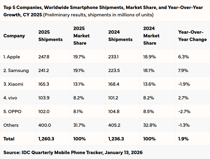 以下为2025年Q4全球智能手机出货量前五品牌及相关数据: