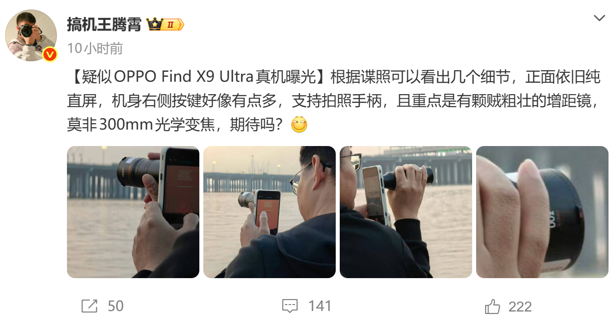 照片显示,新机正面采用纯直屏设计,右侧配备多枚按键;支持拍照手柄,可能支持300mm光学变焦的增距镜。