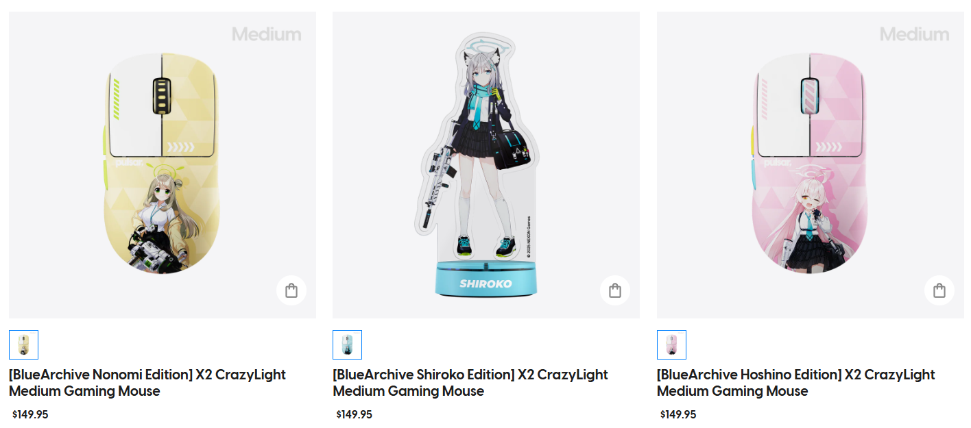 1月21日, Pulsar派世正式推出3款《蔚蓝档案》联名X2 CrazyLight(中号)鼠标,设计主题为阿拜多斯高中的3个角色:小鸟游星野、砂狼白子、十六夜野乃美(十六夜野宫)。