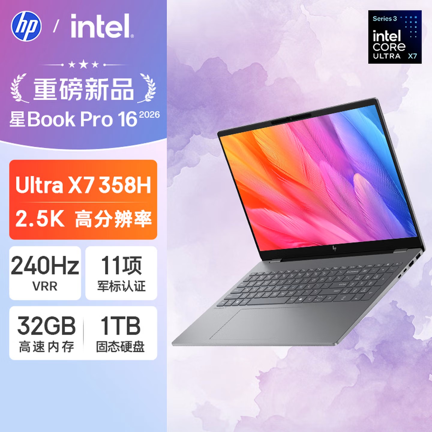 今日,惠普星Book Pro 16 2026款上架电商平台并开售,新机国内首发搭载了英特尔酷睿Ultra X7 358H处理器,仅提供32GB+1TB一个版本,定价为7999元。