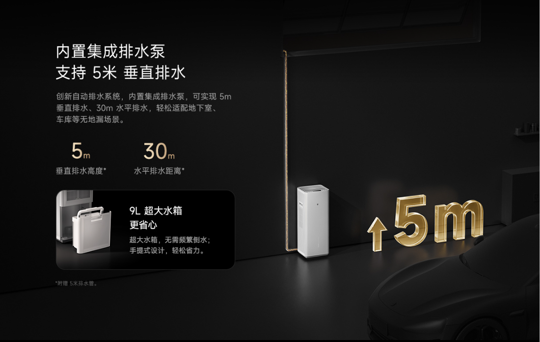 米家变频净化除湿机Max集成了自动排水系统,可实现5m的垂直排水和30m的水平排水,适用于底下车库等场景。