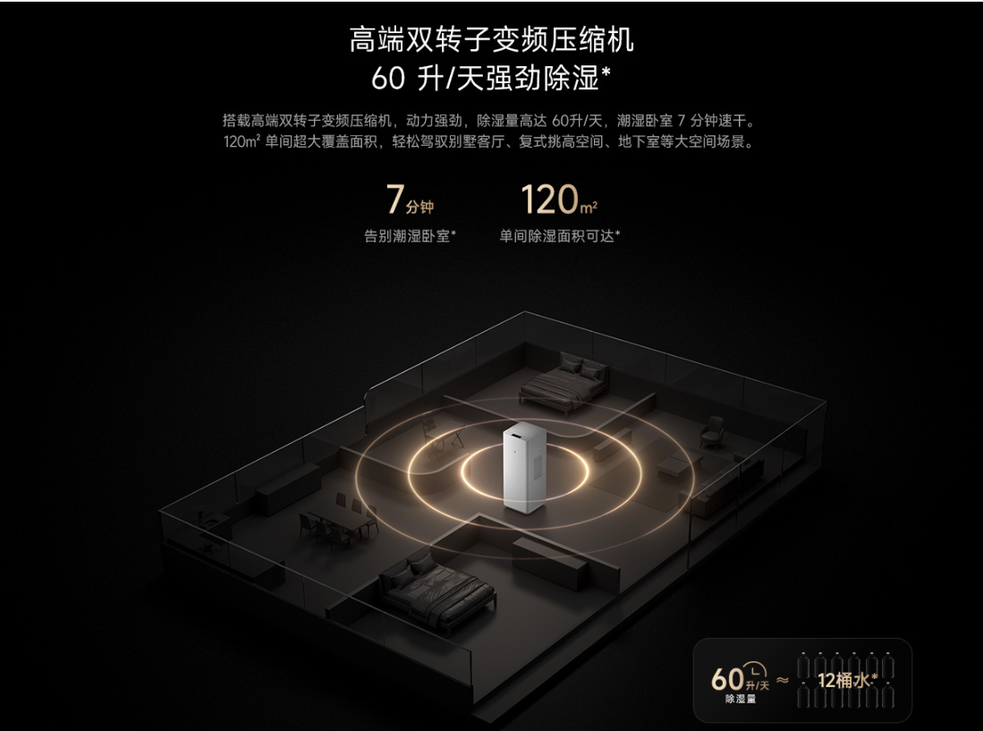 米家变频净化除湿机Max采用高端双转子变频压缩机,除湿量可达60升每天,覆盖面积达单间120㎡。