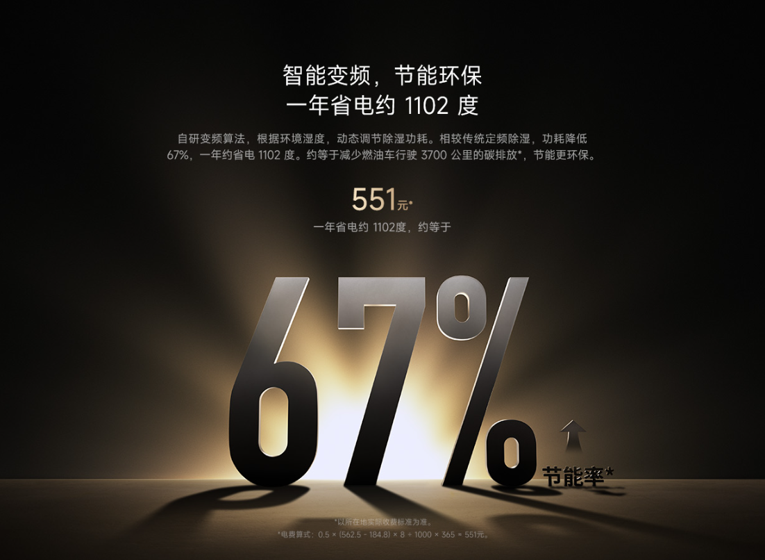 米家变频净化除湿机Max还采用了自研变频算法,能根据环境湿度动态调整除湿功耗。官方称,相较传统定频除湿,米家变频净化除湿机Max的除湿功耗能降低67%,一年约节省1102度电。