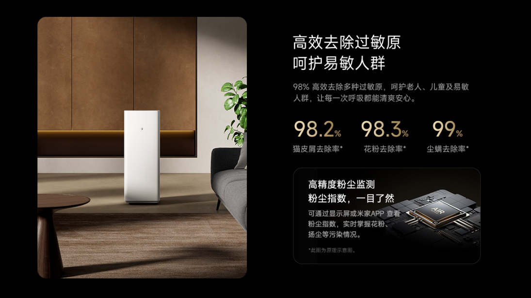 米家变频净化除湿机Max还具备空气净化功能,官方称其能去除多种过敏源,去除率均可达到98%以上,它还配有除醛滤层,能有效吸附装修和家具挥发的甲醛等有害物质。