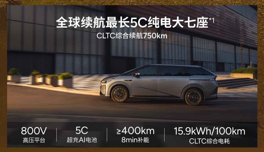 续航方面,新车号称“全球续航最长5C纯电大七座”,搭载800V高压平台、5C超充AI电池,CLTC综合电耗为15.9kWh/100km,CLTC综合续航为750km。