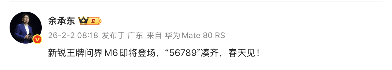 2月2日,华为常务董事、产品投资委员会主任、终端BG董事长余承东宣布,“新锐王牌问界M6即将登场”,并表示该车将在春天和大家见面。