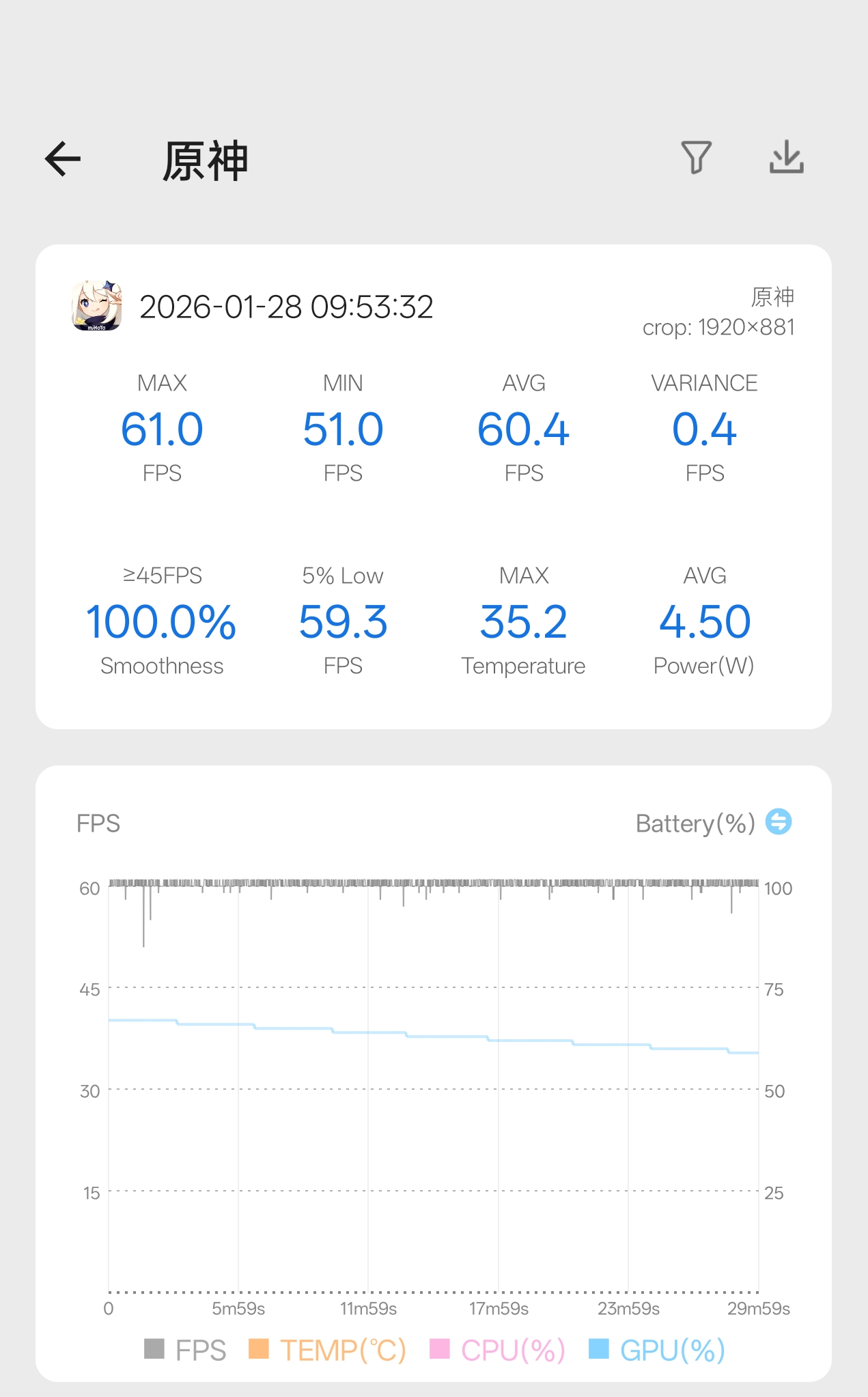 再来看看《原神》30分钟跑图,跑图期间遇怪打怪,画质设置在全最高+60帧,测试过程中帧率基本平稳,没有比较大的波动,最终测试结果为平均帧率60.4帧,详细信息如下。