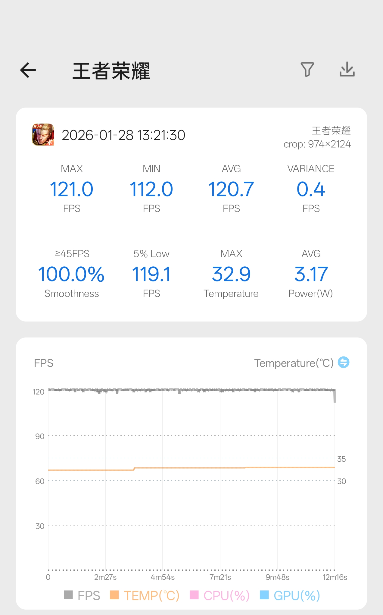 《王者荣耀》就更不用多说了,连续玩了三局,帧率基本全程都在120帧左右,对于这类游戏OPPO Find X9 Pro还是完全无压力的。最后一局的详细测试数据如下: