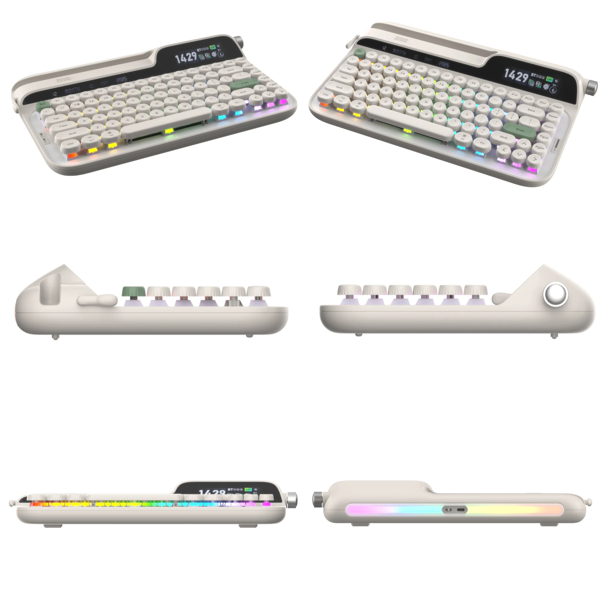 外观方面,EPOMAKER Glyph采用75配列复古打字机风格设计,拥有圆形PBT材质热升华工艺键帽,并配备有多功能2.79英寸旋钮控制屏幕、线性手感的紫藤花轴、氛围灯带等。