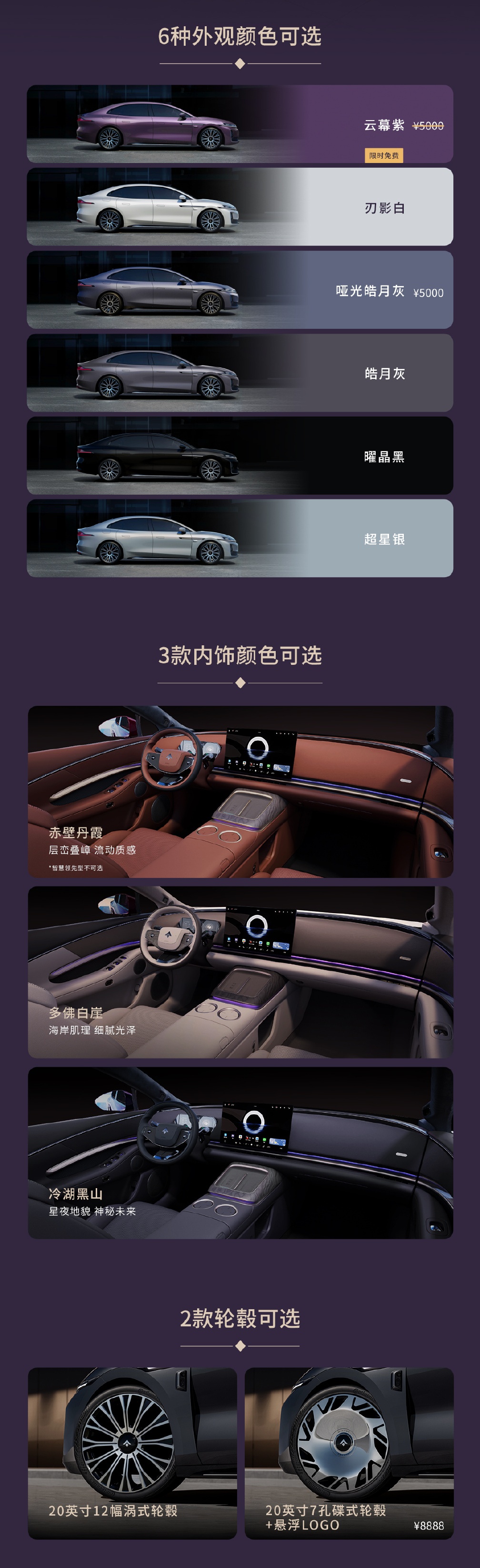 据官方海报显示来看,昊铂A800提供了包括云幕紫、刃影白、哑光皓月灰、皓月灰、曜晶黑、超星银等在内的6种可选车色,还提供了3种可选内饰颜色,如赤壁丹霞、多佛白崖、冷湖黑山。轮毂方面则有2个款式可供选择,分别是20英寸12幅涡式轮毂、20英寸7孔碟式轮毂+悬浮LOGO。