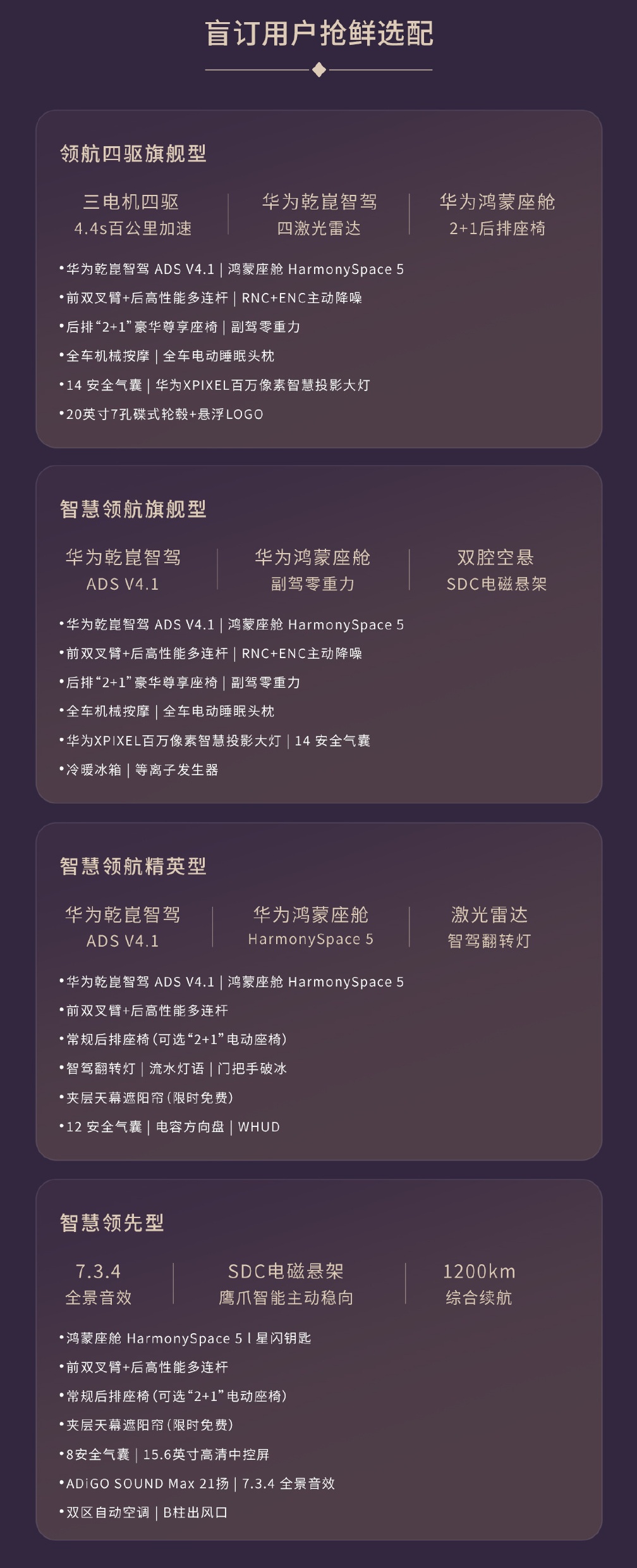 值得提及的是,这次广汽昊铂给盲订用户提供了4款可选车型,分别是领航四驱旗舰型、智慧领航旗舰型、智慧领航精英型和智慧领先型。其中的领航四驱旗舰型版本,拥有三电机四驱、华为乾崑智驾四激光雷达、华为鸿蒙座舱等核心亮点,以及副驾零重力、14安全气囊、全车机械按摩、全车电动睡眠头枕等配置。