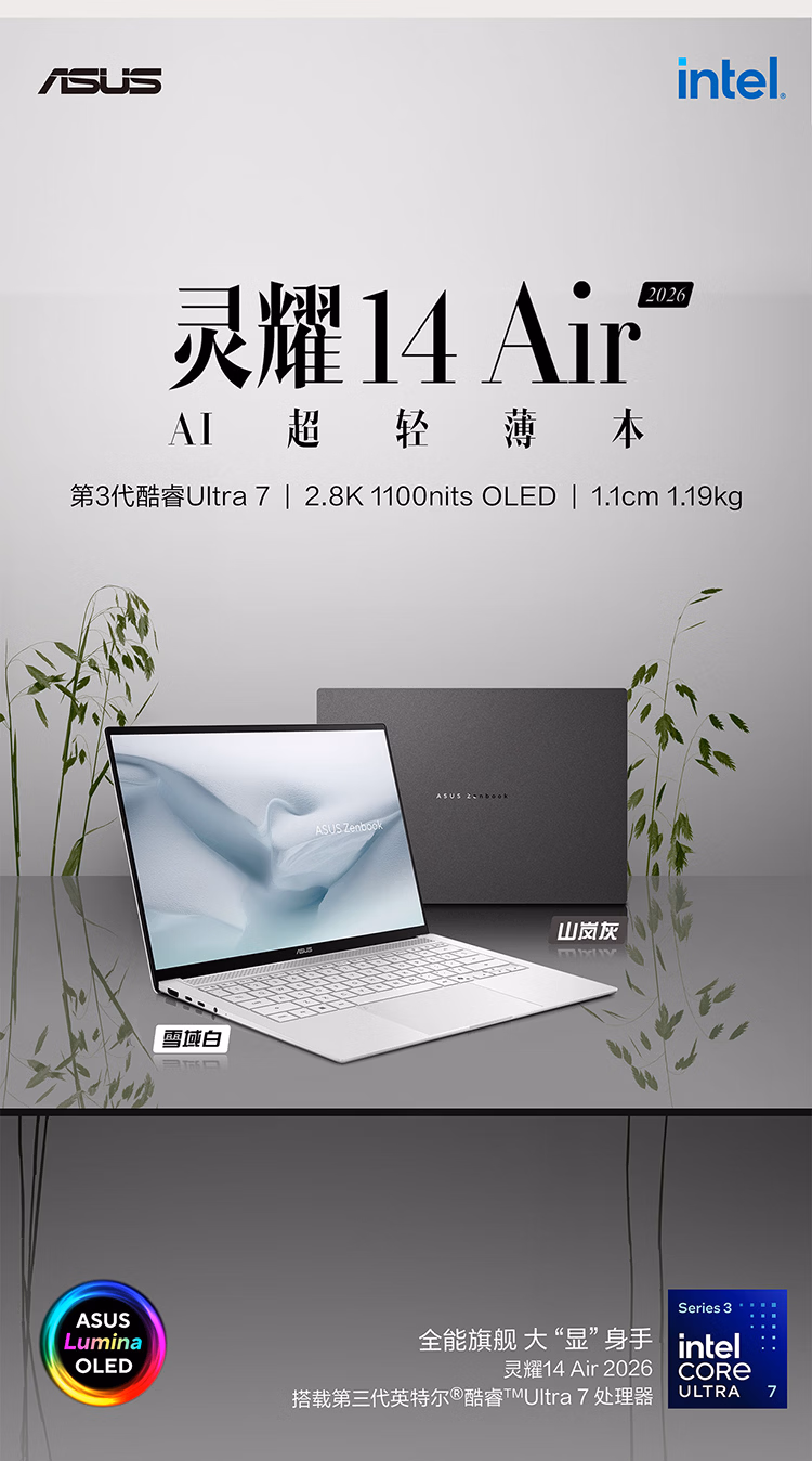 根据官方自营旗舰店信息,灵耀14 Air 2026提供雪域白、山岚灰两种配色。机身采用CNC一体成型工艺,整机厚度1.1cm,重1.19kg。该机配备一块2880x1800分辨率的120Hz OLED面板,峰值亮度达1100尼特,覆盖100% DCI-P3色域。