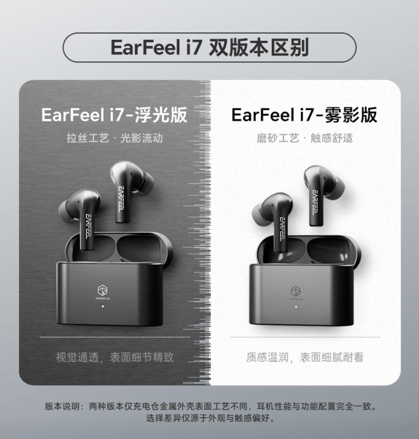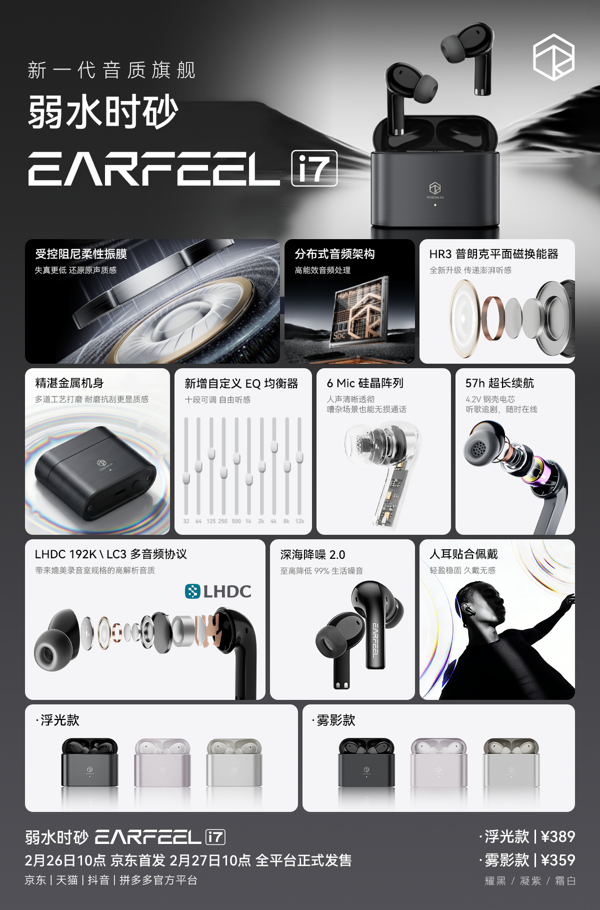 弱水时砂EarFeel i7将于2月26日京东首发,2月27日全平台上线,其中雾影款售价359元起,浮光款389元起。两种版本仅充电仓金属外壳工艺不同,耳机性能完全一致。