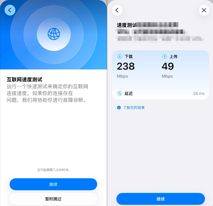 在最新「Apple支持」应用内,用户可按照“「Apple支持」App→选择设备→设备性能→互联网速度测试→按步骤运行速度测试”的路径进行操作。测试结束后,应用会显示设备的下载速率、上传速率以及延迟情况。若用户想测试移动数据流量的速率,只需关闭Wi-Fi,打开蜂窝网络再进行测试即可。